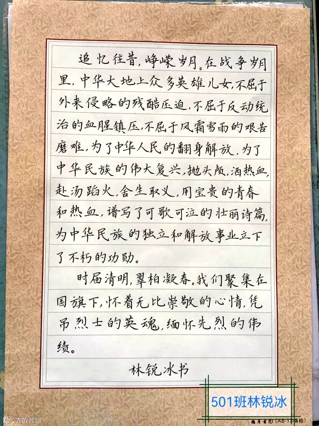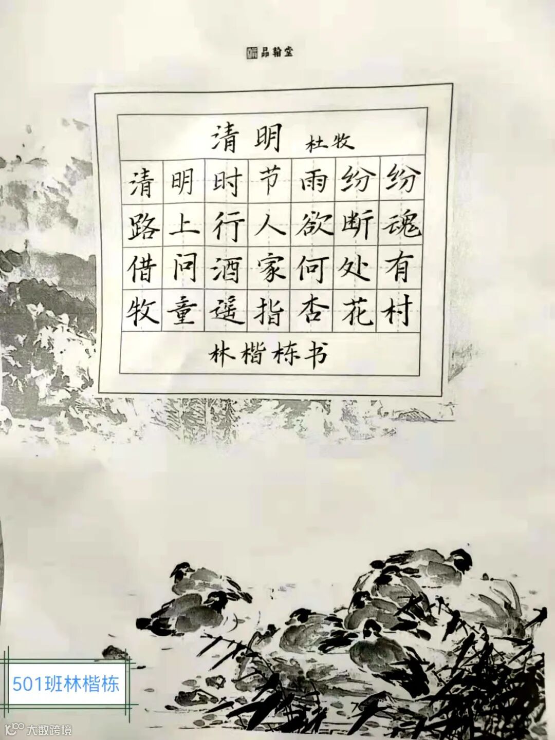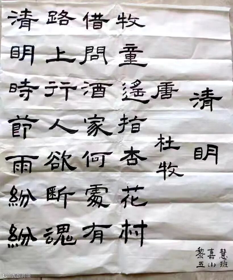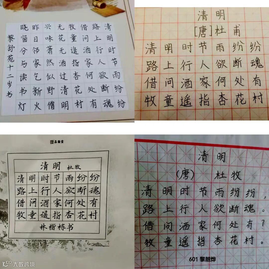 每逢清明节,天空中总会滑落毛毛细雨,空气里弥漫着稻草和鲜花的香味。不禁让人想起唐代诗人杜牧的《清明》:清明时节雨纷纷,路上行人欲断魂。借问酒家何处有,牧童遥指杏花村。我校作为广东省硬笔书法特色学校,队员们用纸笔写下清明节诗词书法作品。