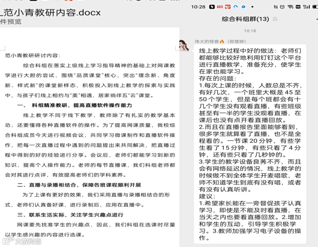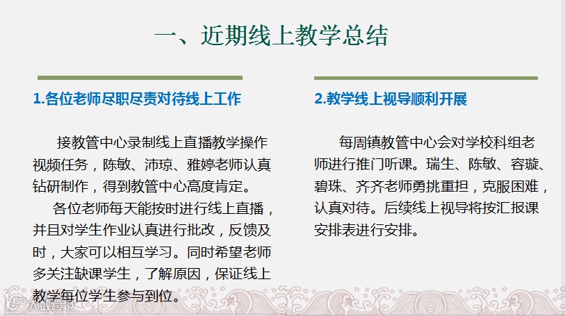 教学有法,研无止境,开展线上教研活动,各科组老师积极交流,教学相长,既学习了别人新颖的教学方法,又认识到自己教学中的不足,老师们解开了线上教学的疑团。在孜孜不倦地探寻教学新方法的路上,我们的教学水平一定能迈上一个新的台阶!沉心潜蓄势,花开会有时,疫情总会过去,师生们共同期待重返校园的春暖花开时!
