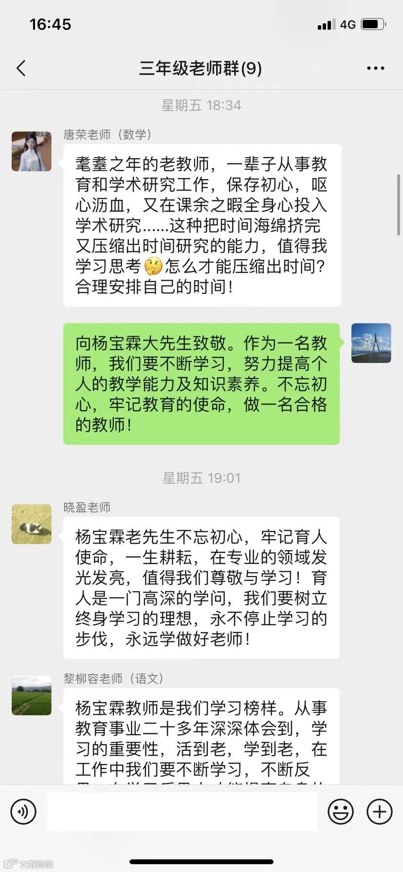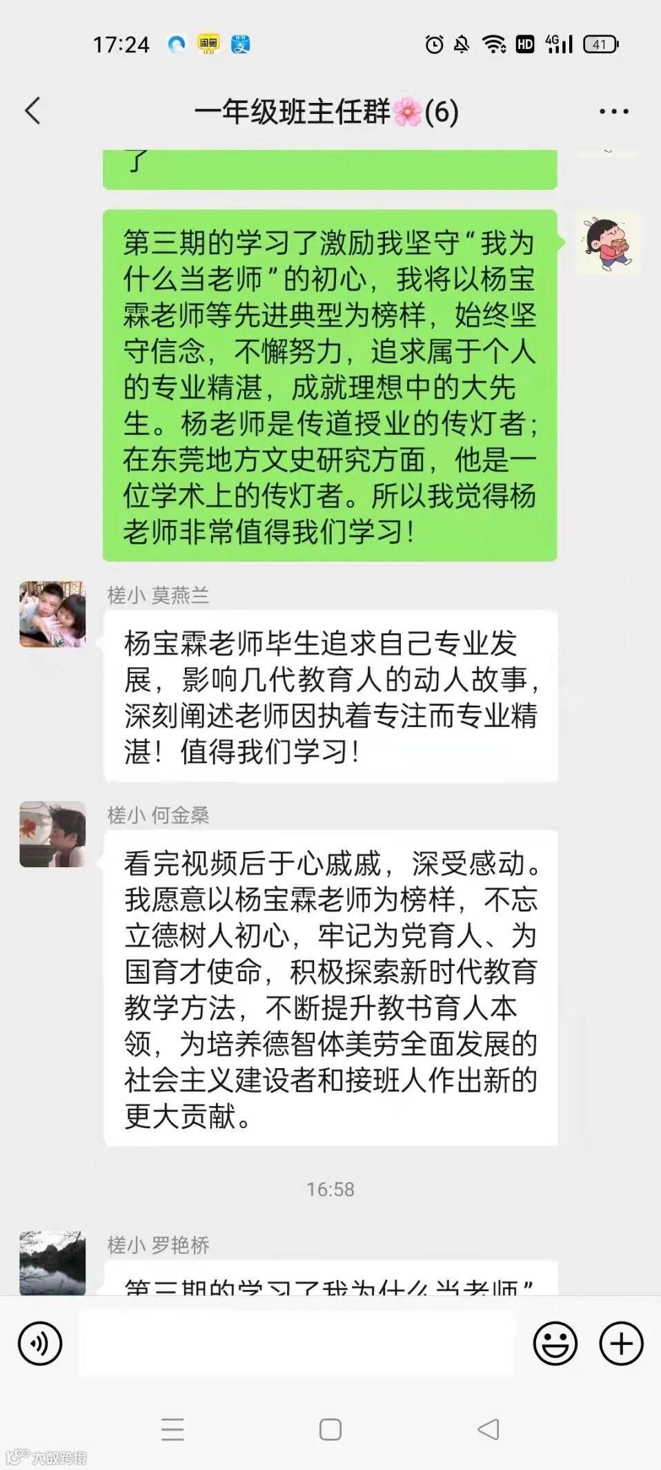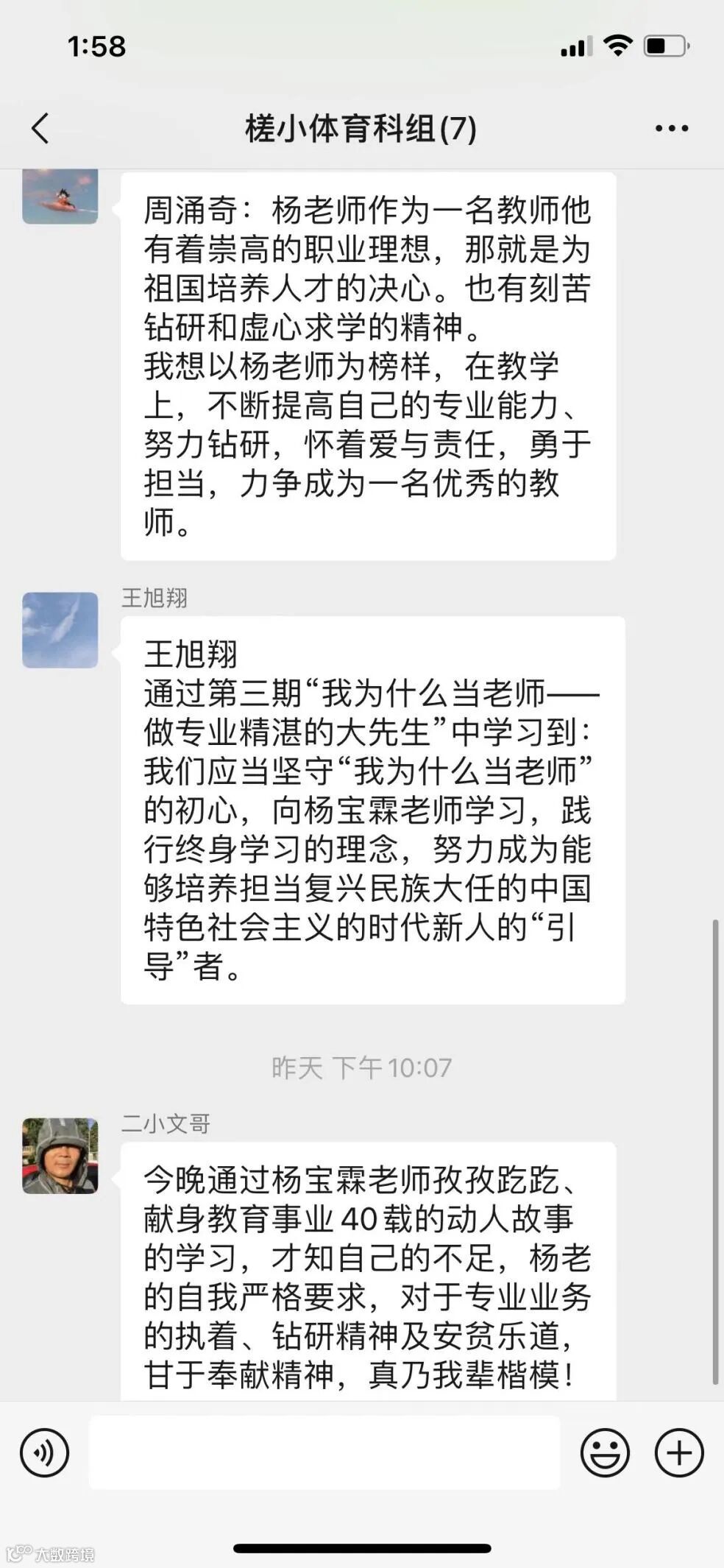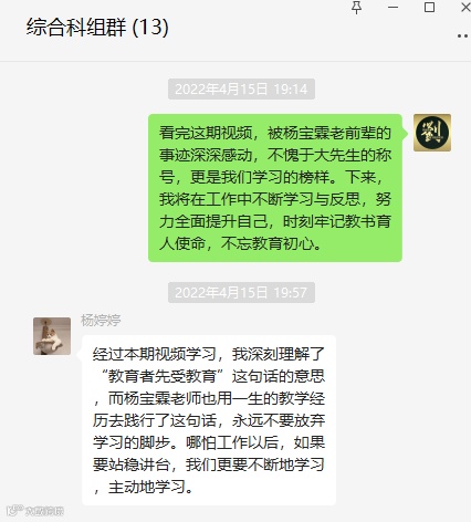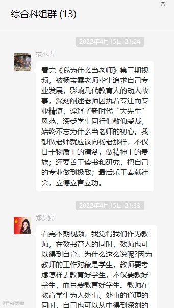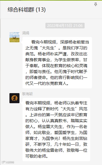 在善于反思中提升专业。视频观看完后,各年级、各科组组织教职工学习讨论,激励大家坚守“我为什么当老师”的初心,以杨宝霖老师等先进典型为榜样,始终坚守信念,不懈努力,来看看他们是怎样说的: