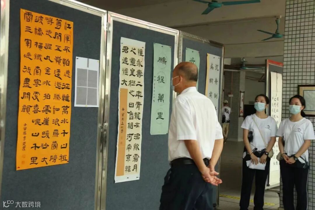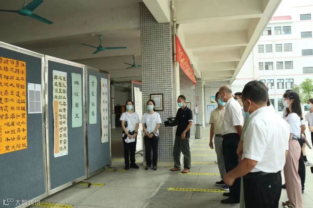 八点五十分,在合照结束后,领导在校方和志愿者们的陪同下参观学生和志愿者们的书法作品,各作品字形正倚交错,大大小小,开开合合,线条粗细变化明显,跌宕有致。这些赏心悦目、引人遐想的作品获得了领导们的一致好评。