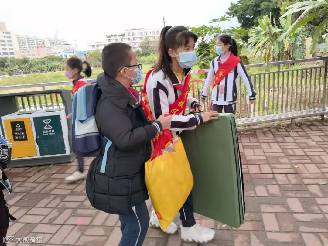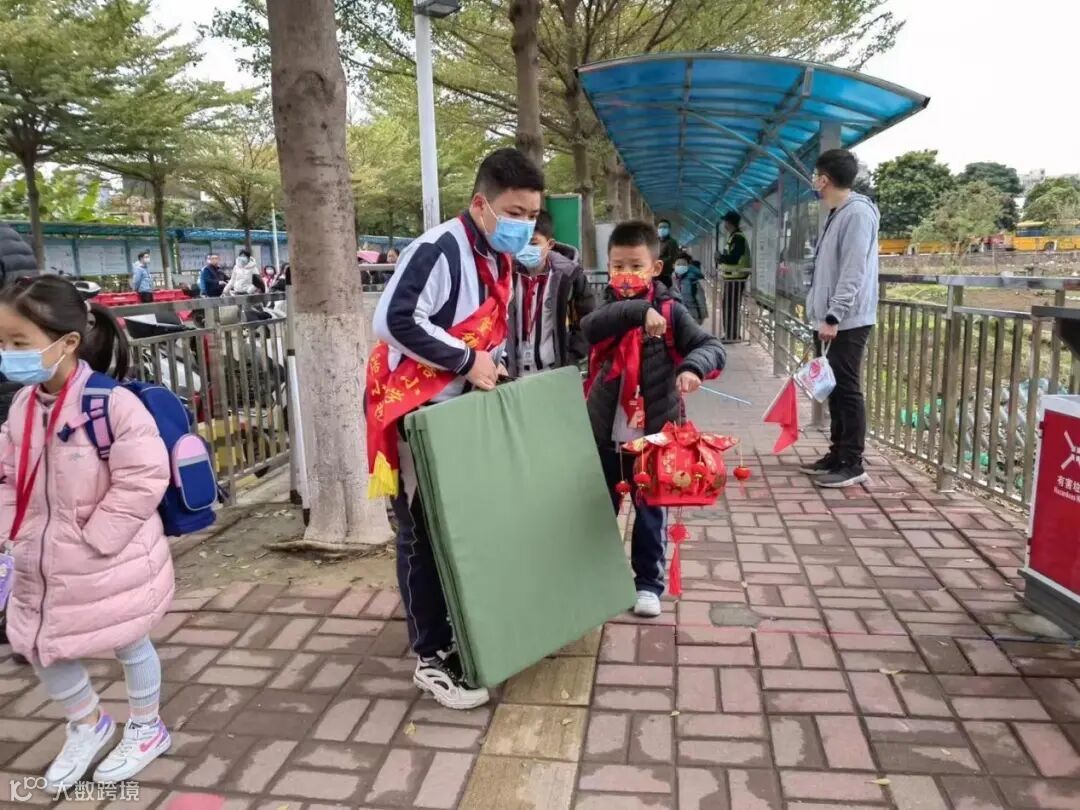 为更好地做好防疫工作,家长不能进入校园,低年级同学的生活用品由高年级的少先队干部哥哥姐姐帮忙拿到教室。