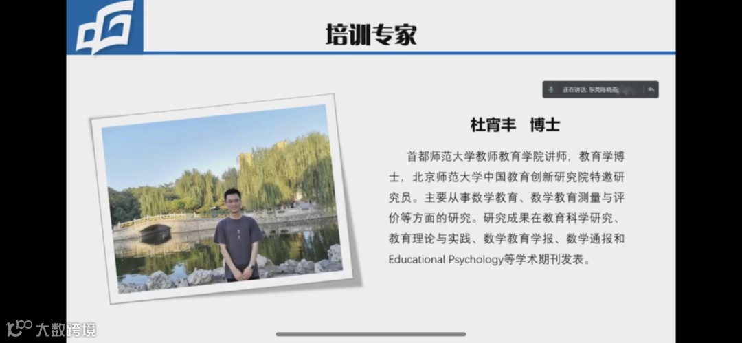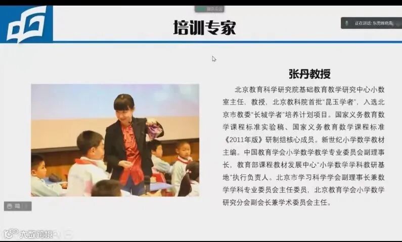 本次培训由北京教育科学研究院基础教育教学研究中心小数室主任张丹教授、首都师范大学教师教育学院讲师、教育学博士杜宵丰以及北京市东城区教育科学研究院小学数学研究员王彦伟开展专题培训。