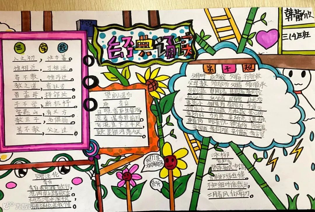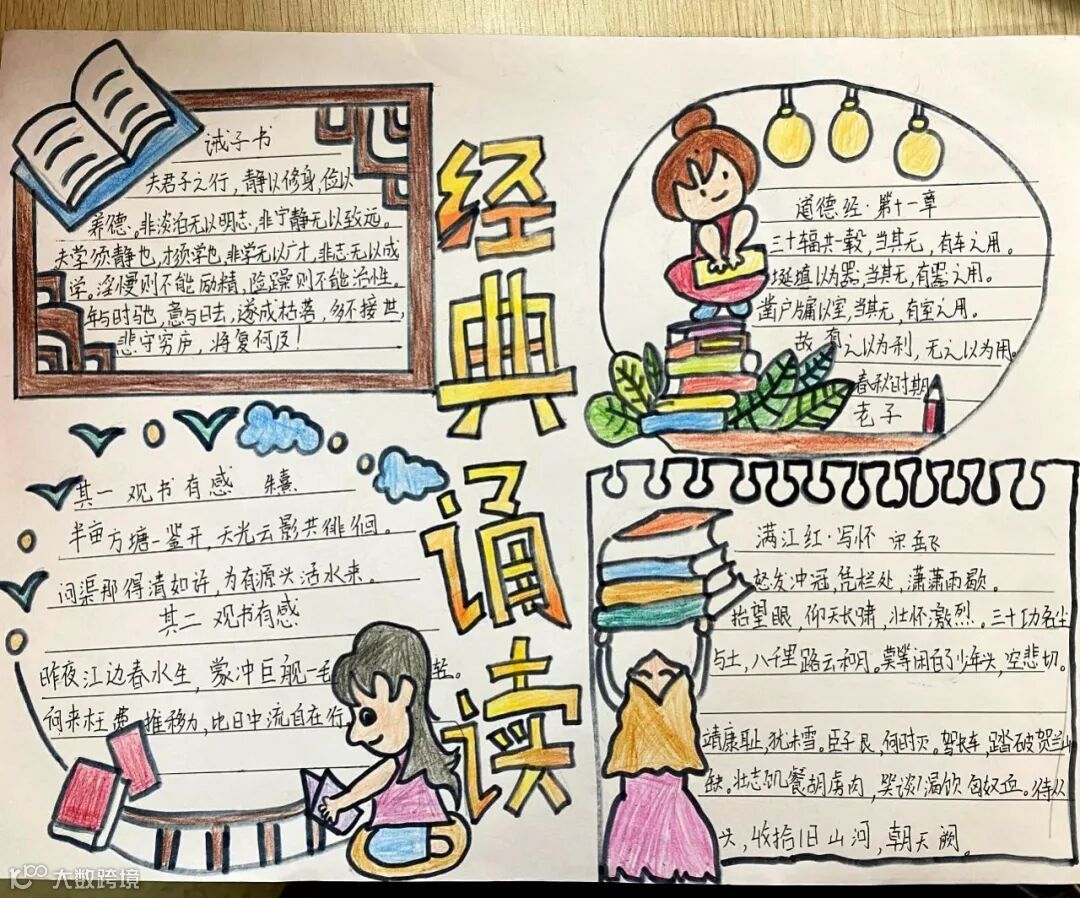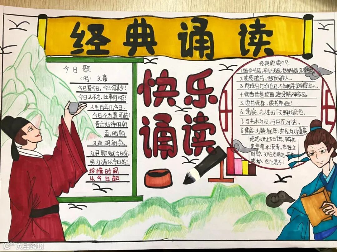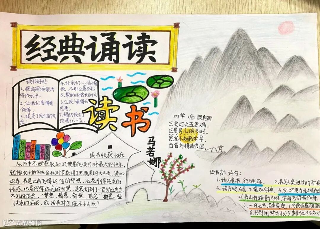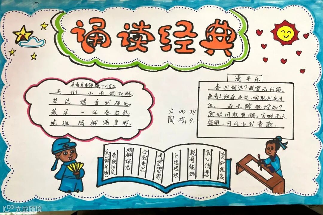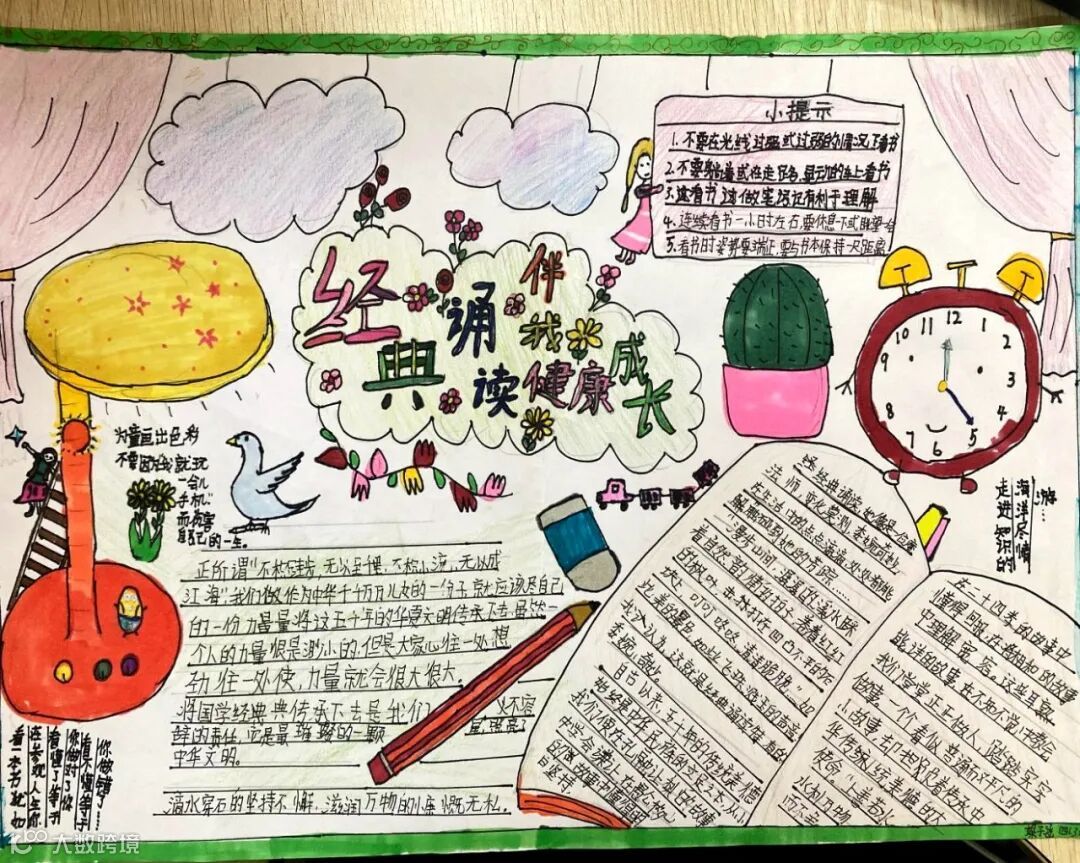 在主题手抄报评选活动中,学生们借助图文并茂的手抄报形式,分享个性化的品读体验,经典诵读手抄报制作深受同学们的喜爱。精心制作的手抄报内容丰富,有诗配画、名著精彩片段、读书小技巧等等,字里行间体现着对经典美文的热爱。