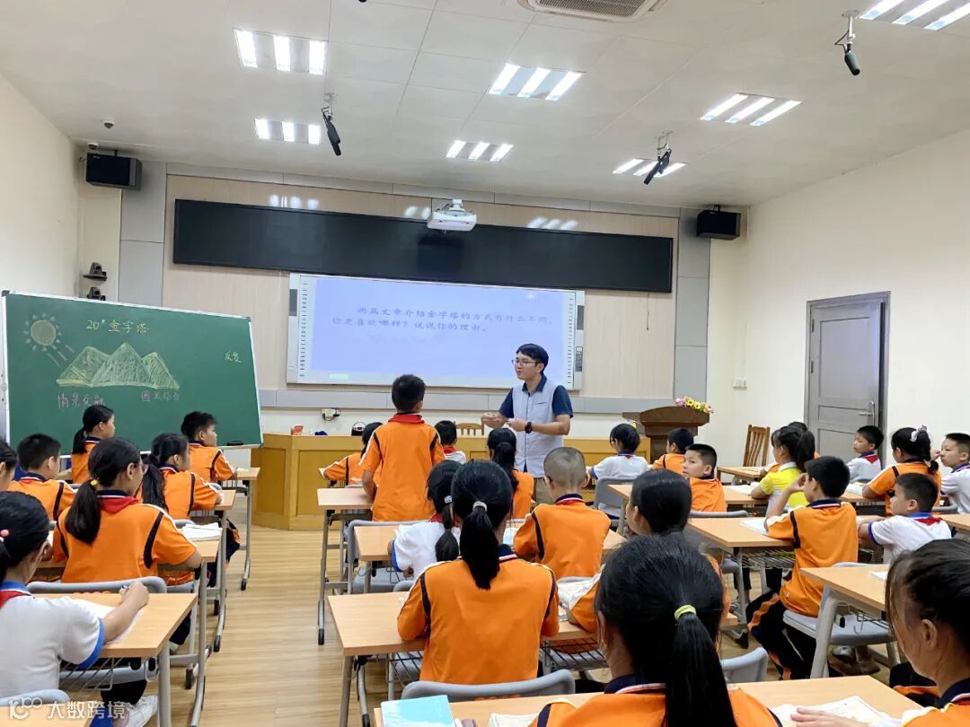 本次活动由唐瑞生老师带来五年级下册课例《20.*金字塔》。上课伊始,唐老师复习回顾本单元所学课文,创设情境,引出课程内容,把学生学习兴趣一下子调动起来。
