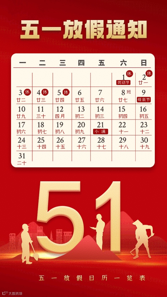 2021年5月1日(星期六)至5月5日(星期三)放假,共5天。其中:4月25日(星期日)补星期二课,5月8日(星期六)补星期三课。