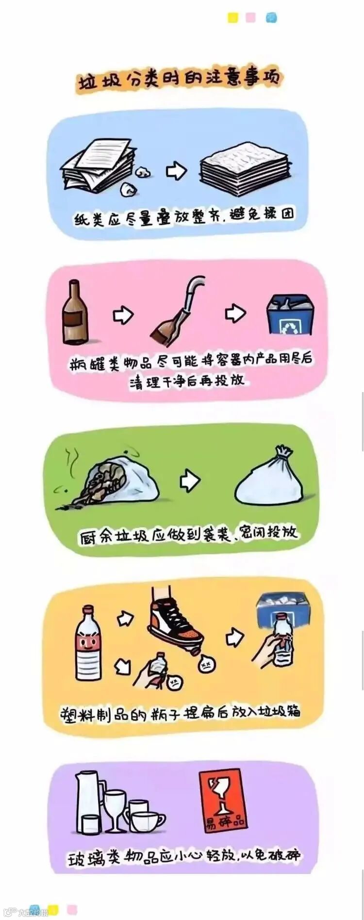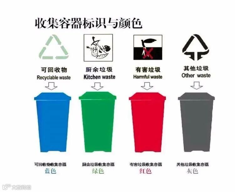 可回收物收集容器为蓝色,有害垃圾收集容器为红色,餐厨垃圾收集容器为绿色,其它垃圾收集容器为灰色。