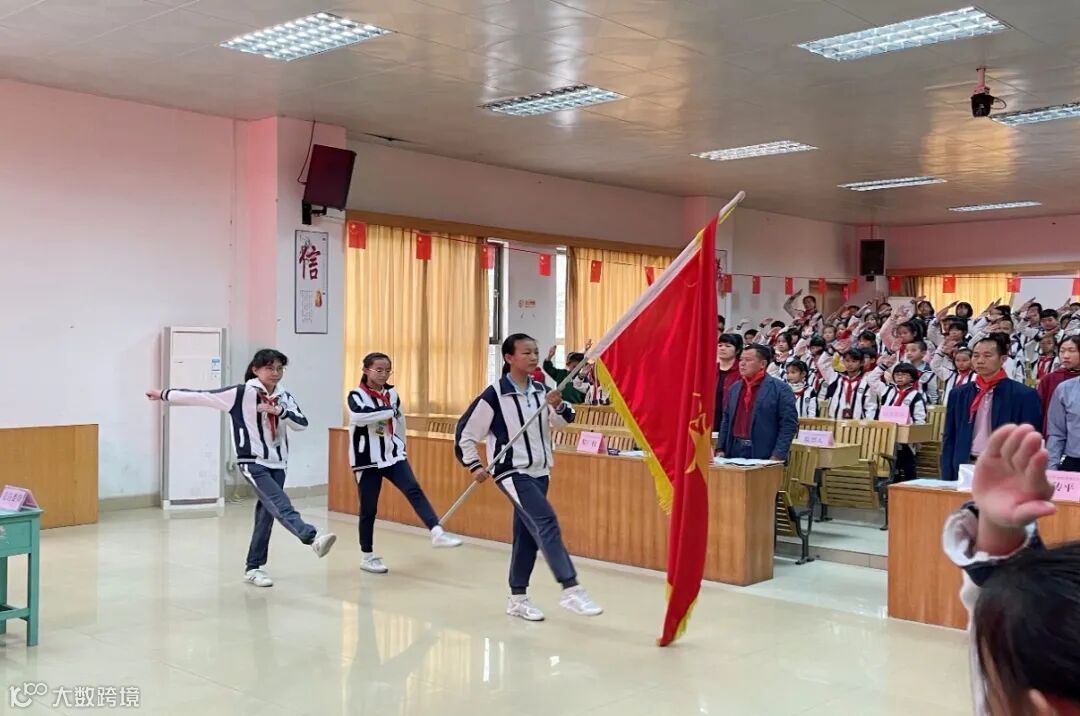 会议在庄严的出旗曲中拉开帷幕,鲜艳的红领巾映红了整个会场,全体参会人员庄严肃立,向队旗致敬。