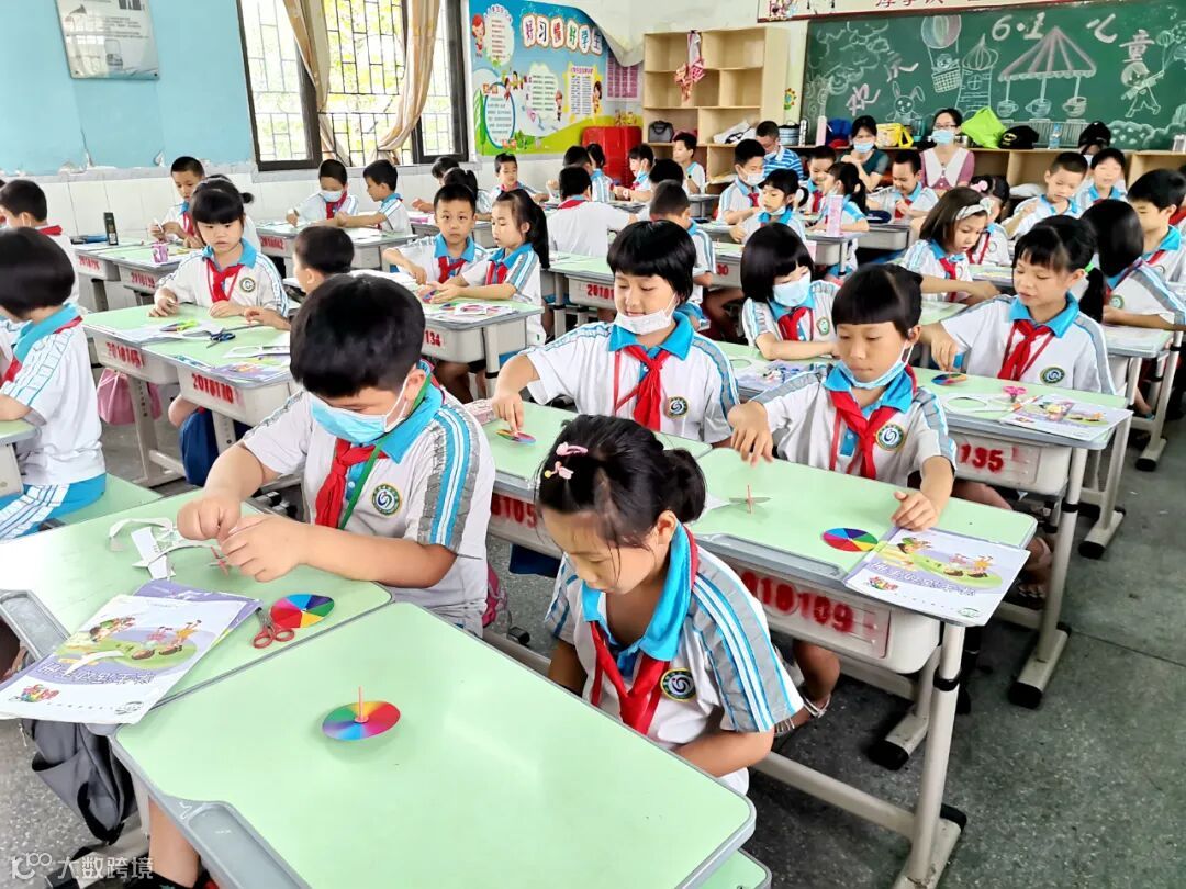 ▲二(3)班的同学们在制作纸陀螺