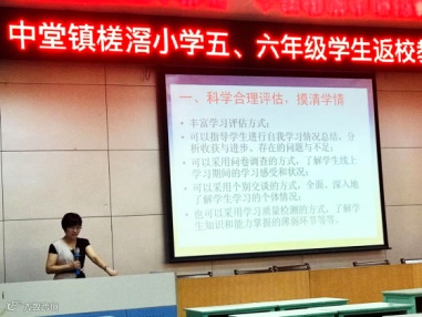 首先刘传平主任对教职员工进行五六年级学生返校工作从以下方面内容进行培训:1.学生返校日工作要求2.人员安排3.返校日学生返校时间4.返校日学生放学时间5.学生上放学时段安排6.学生上下楼梯安排7.课间卫生间使用安排表8.学生课间活动场地安排9.学生用餐位置安排表10.师生回校氛围布置11.天气变化如何应对。刘主任一一细化工作要求,确保全体教职员工明确学生返校后自己工作责职,确保学生在校安安全全。