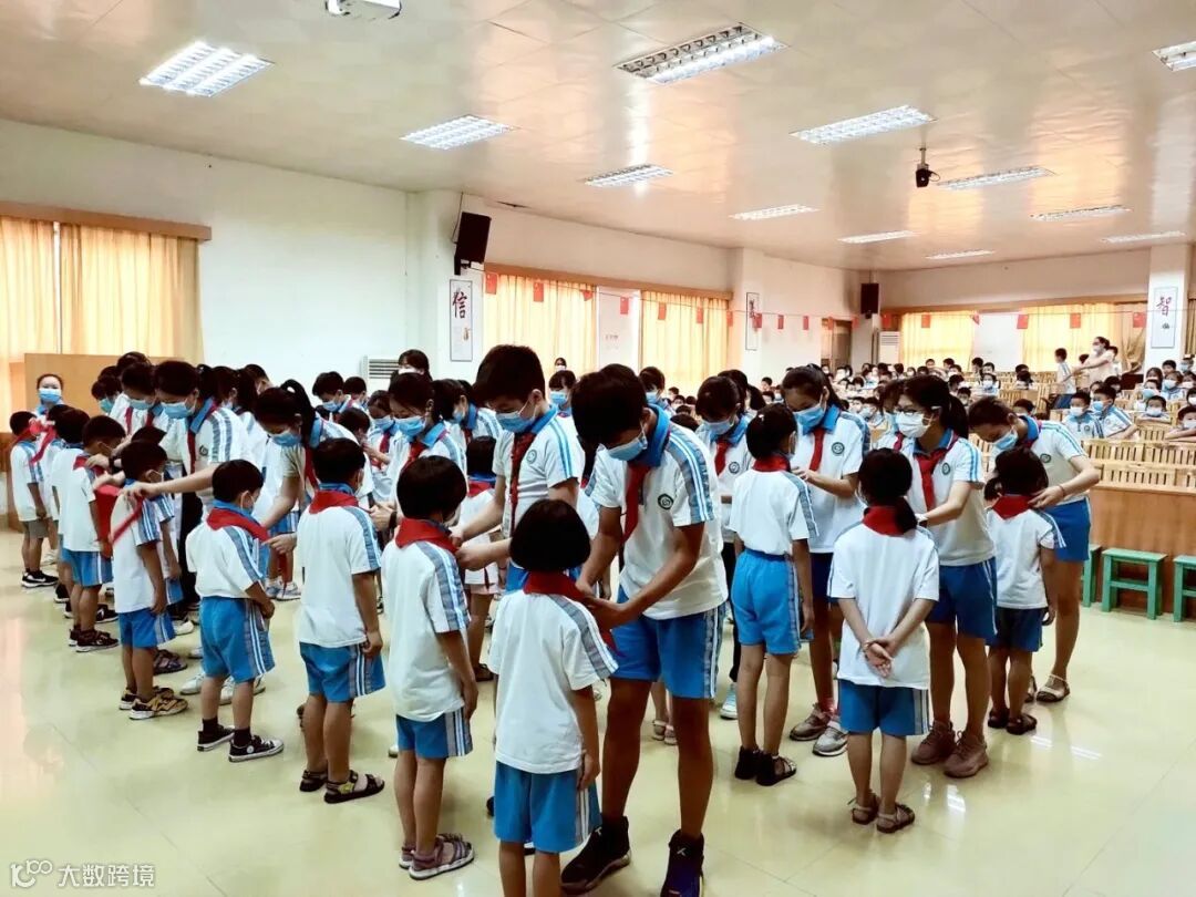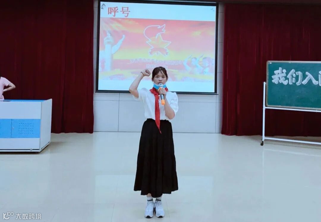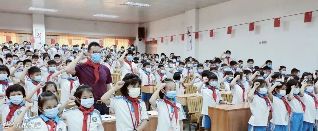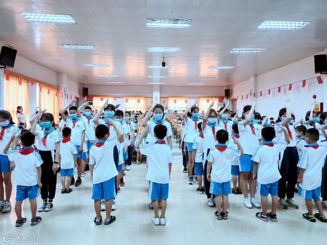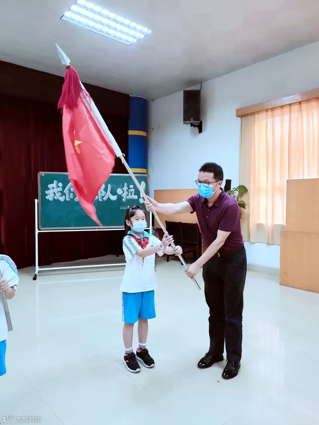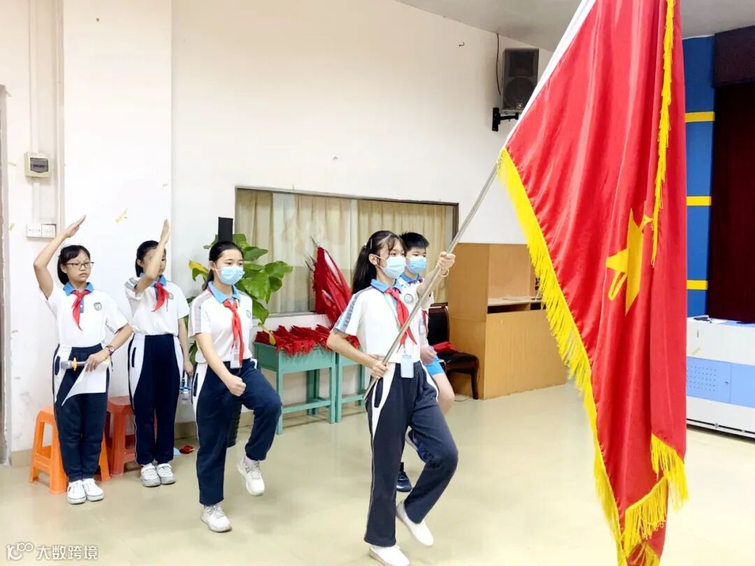 在大队辅导员肖玉婷老师的带领下,队员们庄严地举起右手,在队旗下光荣地宣誓和呼号“时刻准备着,为共产主义事业而奋斗!”