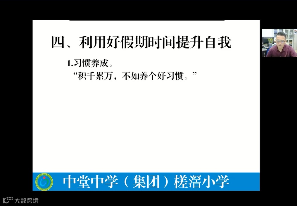 为做好假期前后学校工作衔接、学生假期安全管理和家校沟通。在这学期即将结束之际,我校学于2020年7月22日晚上召开了“改变从暑假开始”为主题的线上家长会,全校24个班共1100多名家长收看了本次家长会视频直播。