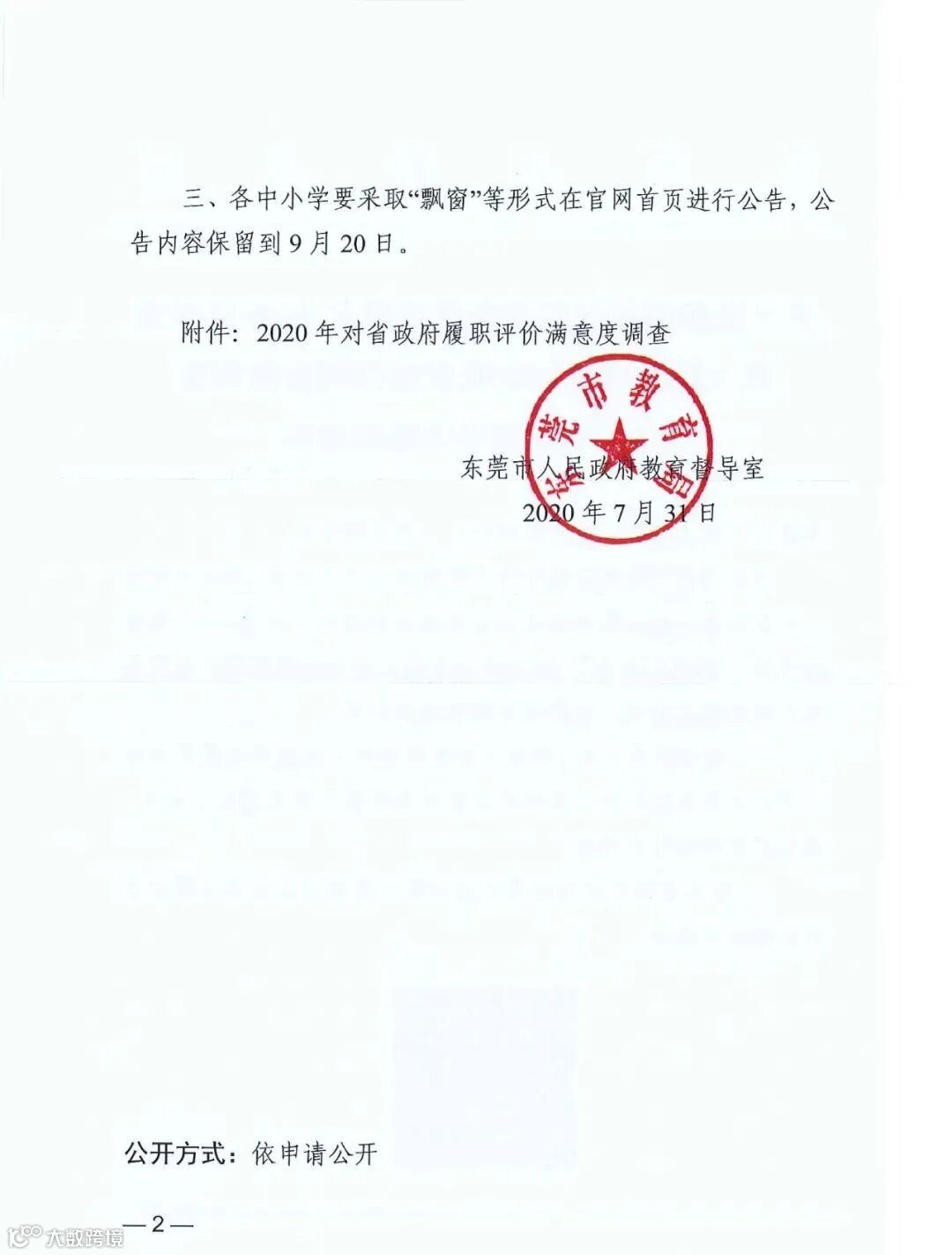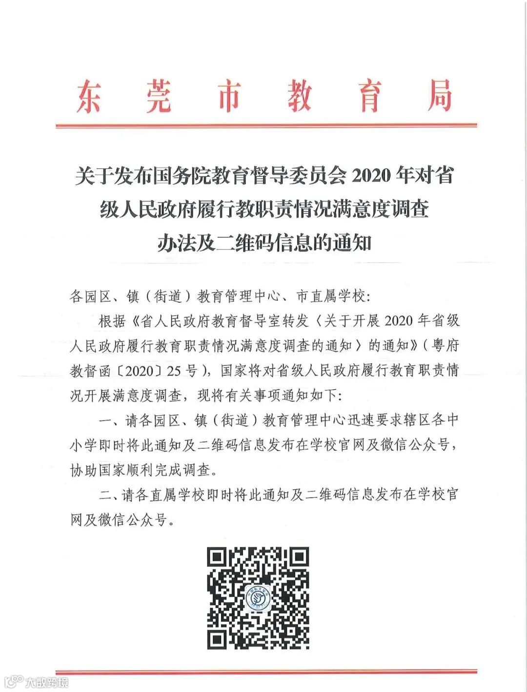 中堂中学教育集团槎滘小学根据《关于发布国务院教育督导委员会2020年对省级人民政府履行教育职责情况满意度调查办法及二维码信息的通知》要求,现把政府履行教育职责信息发布在学校官网及微信公众号,协助国家顺利完成调查。请全体教职员工积极参与该项调查。