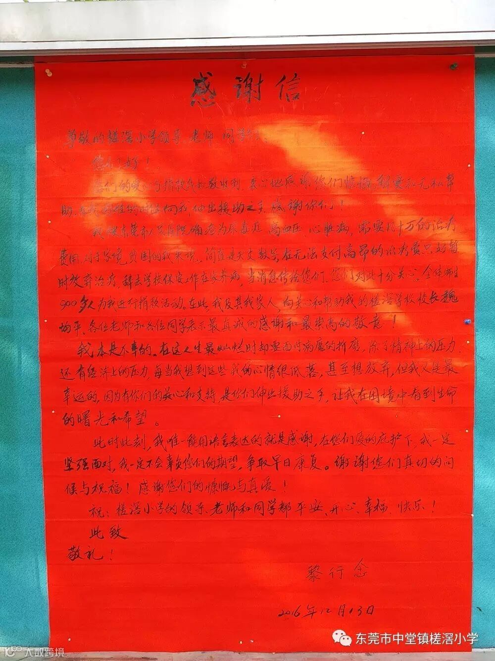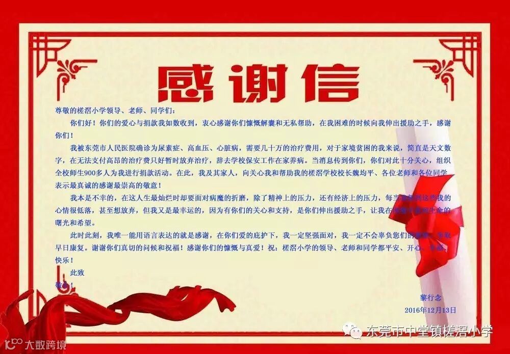 我被东莞市人民医院确诊为尿素症、高血压、心脏病,需要几十万的治疗费用,对于家境贫困的我来说,简直是天文数字,在无法支付高昂的治疗费只好暂时放弃治疗,辞去学校保安工作在家养病。当消息传到你们,你们对此十分关心,组织全校师生900多人为我进行捐款活动。在此,我及其家人,向关心我和帮助我的槎滘学校校长魏均平、各位老师和各位同学表示最真诚的感谢和最崇高的敬意!