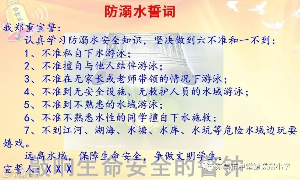夏季是溺水事件高发期,随着天气转热,广东、广西、湖南等地区先后发生学生溺水身亡事件,引起教育部门高度重视。为进一步加强我校防溺水教育,认真学习防溺水安全知识,坚决做到防溺水“六不准”和“一不到”。2017年5月19日上午,我校利用“安全十分钟”教育进行全体同学防溺水宣誓。通过宣誓,提高学生安全意识,自觉学习防溺水安全的有关知识,改掉生活中不遵守防溺水安全的不良习惯,防范溺水,从我做起。