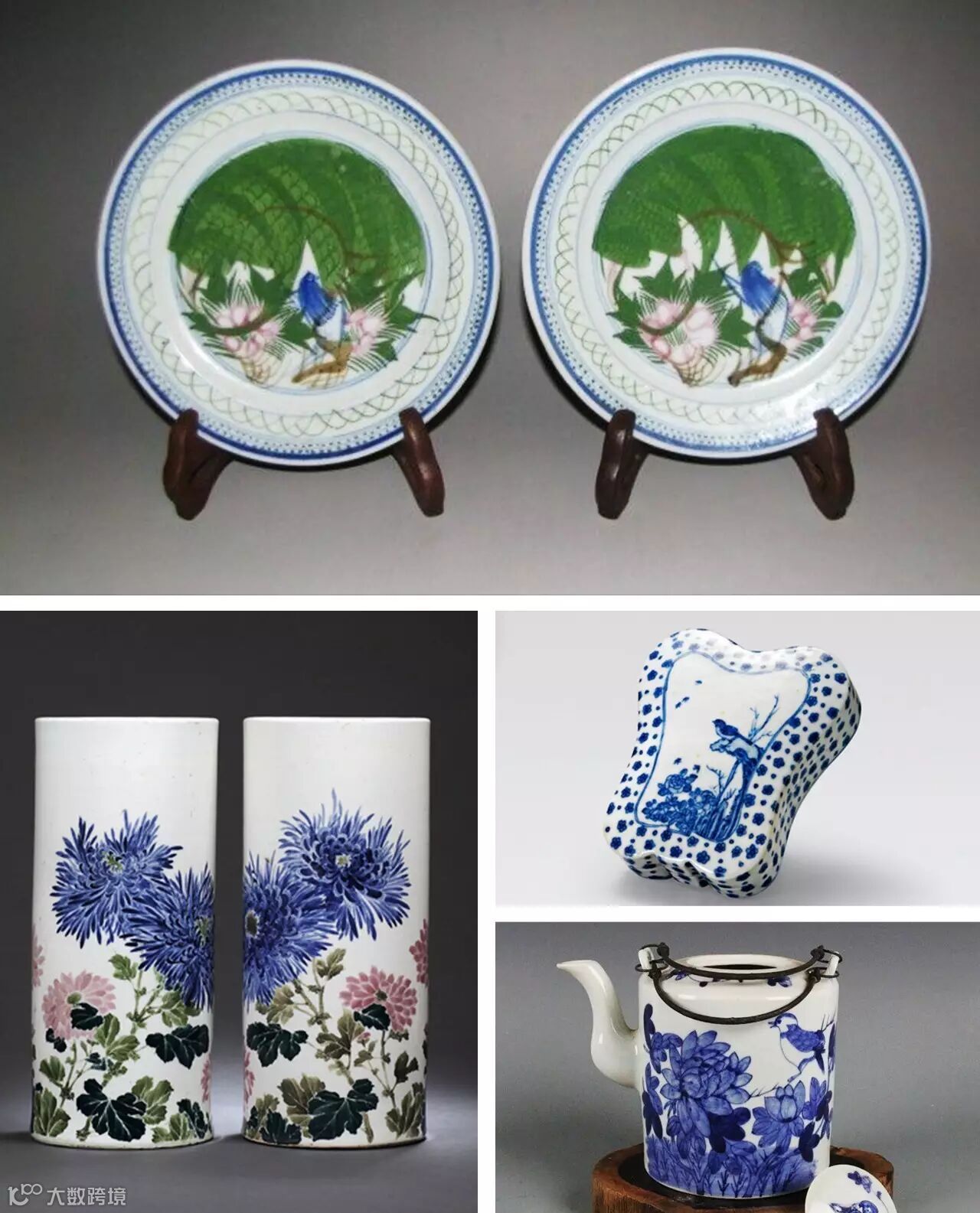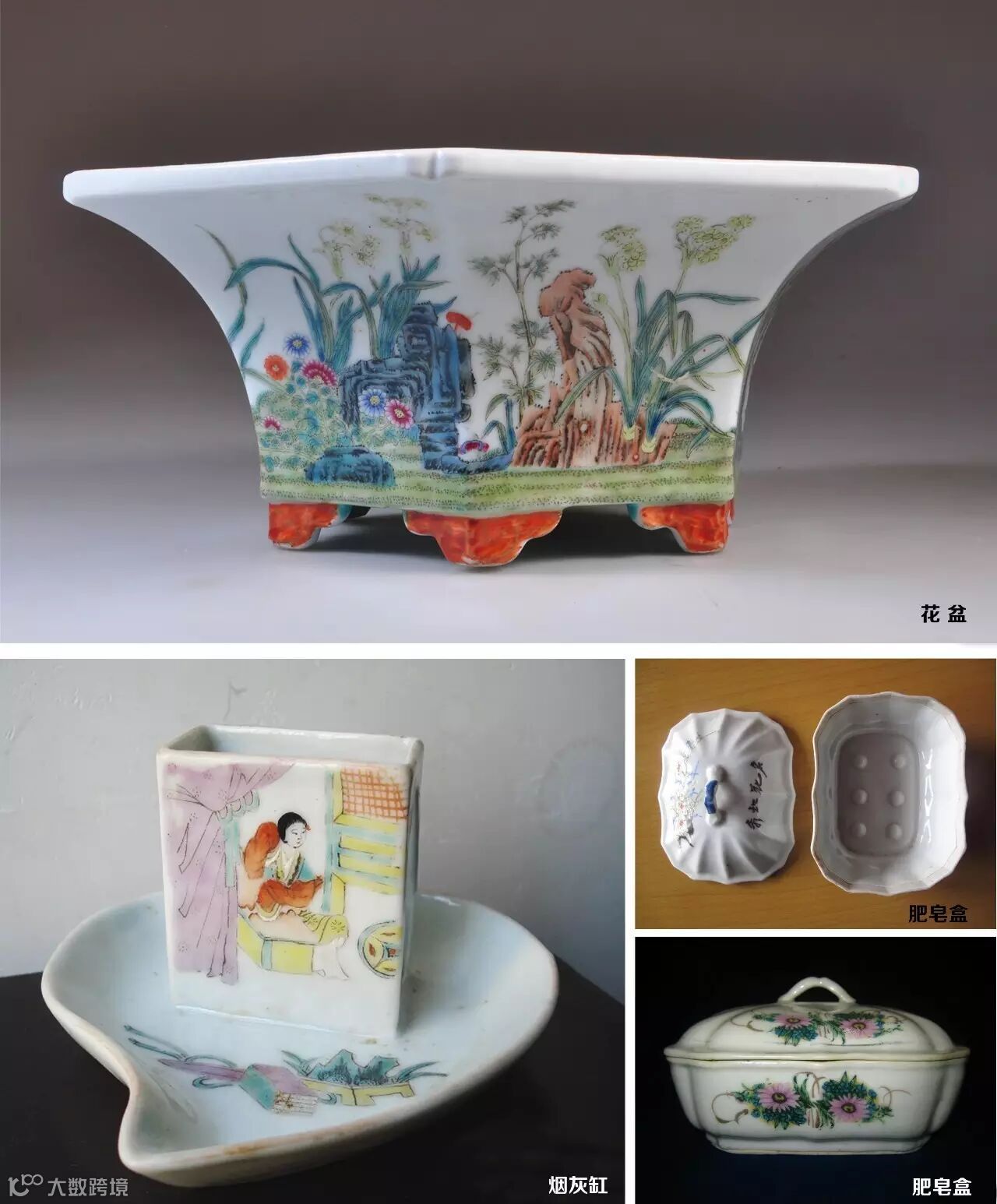 在器型方面,除大量的盘、碗、茶壶、茶碗等饮食器外,烟灰缸、肥皂盒、花盆等各类平常生活用品一应俱全,还多见各式用于陈设或婚嫁的花瓶、捧盒,另外,还有大量的仅具装饰意义的瓷板画。