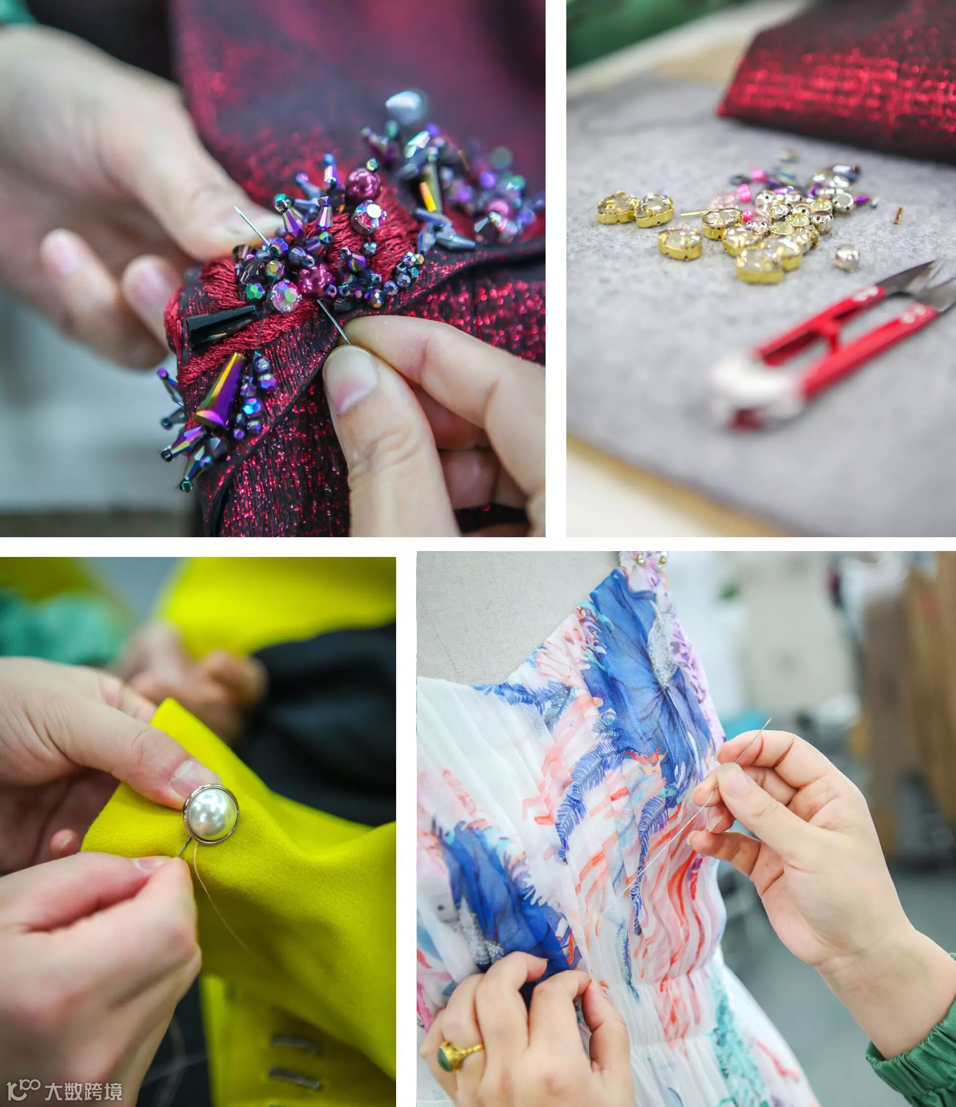 后道手工徐云枚,从事手工工作8年,细小的手缝针在她手中如富魔力,游龙戏凤般游弋于精致的面料,据悉,“手工坊”的工匠们大多已是中年,细密匀而整的针脚是Ta们心稳手稳的注脚。