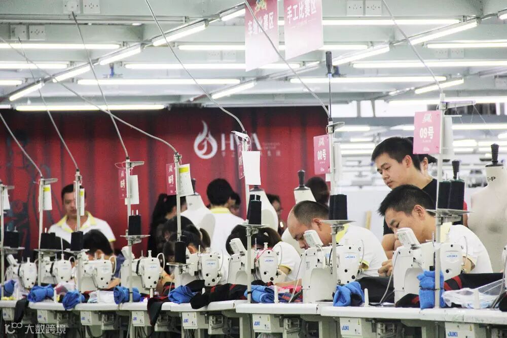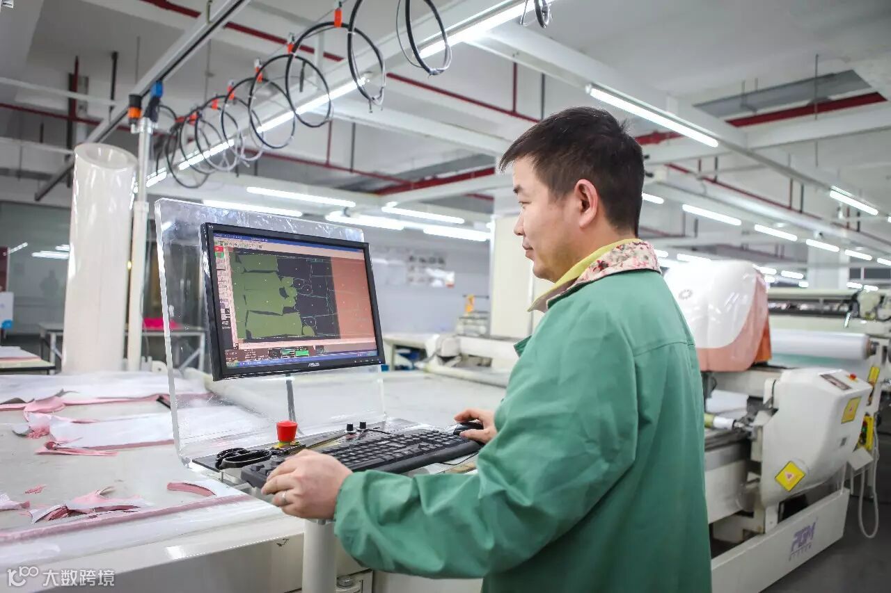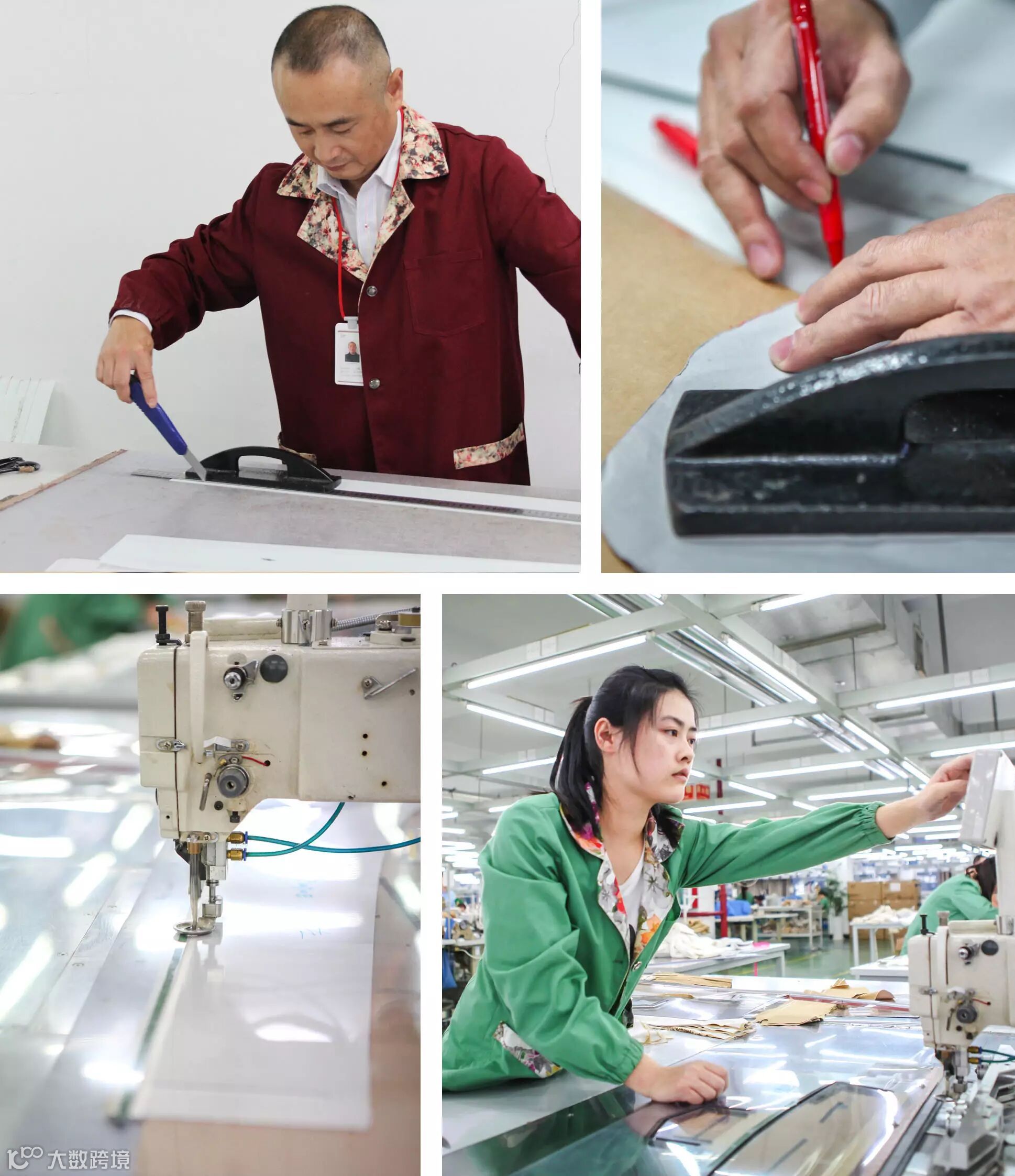 走入生产车间,裁剪区锋利的裁剪刀一丝不苟地穿梭于层层叠叠的面料之间。