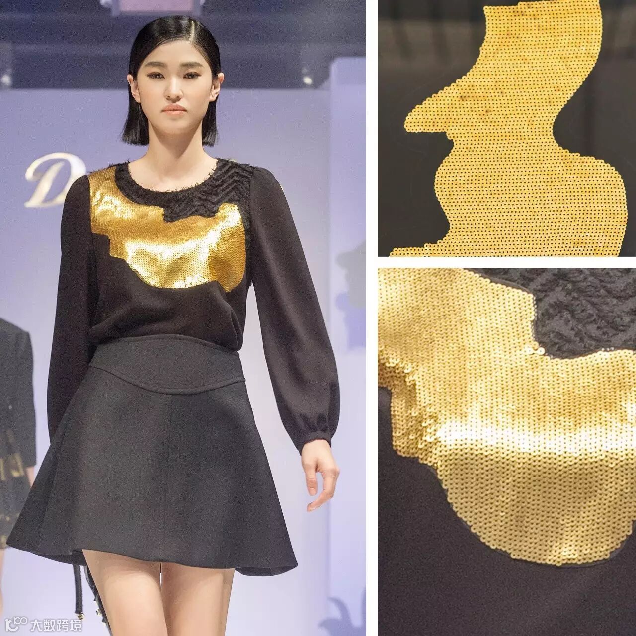 大面积金色珠片绣,凸显品牌系列定位,圆形珠片以点为基础,用点连成线,以线铺成面,层层叠叠,随着人体的走动而折射出闪耀的光彩。