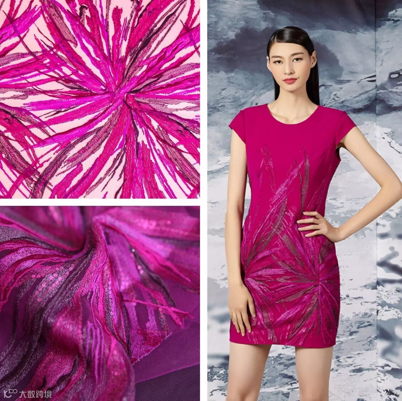 这款纯进口面料,通过复杂的刺绣工艺,将珠片贯穿其中,形成发散状的礼花花型,色彩艳丽,洋溢着浓郁地中海风情……