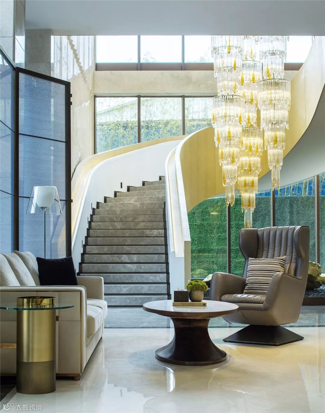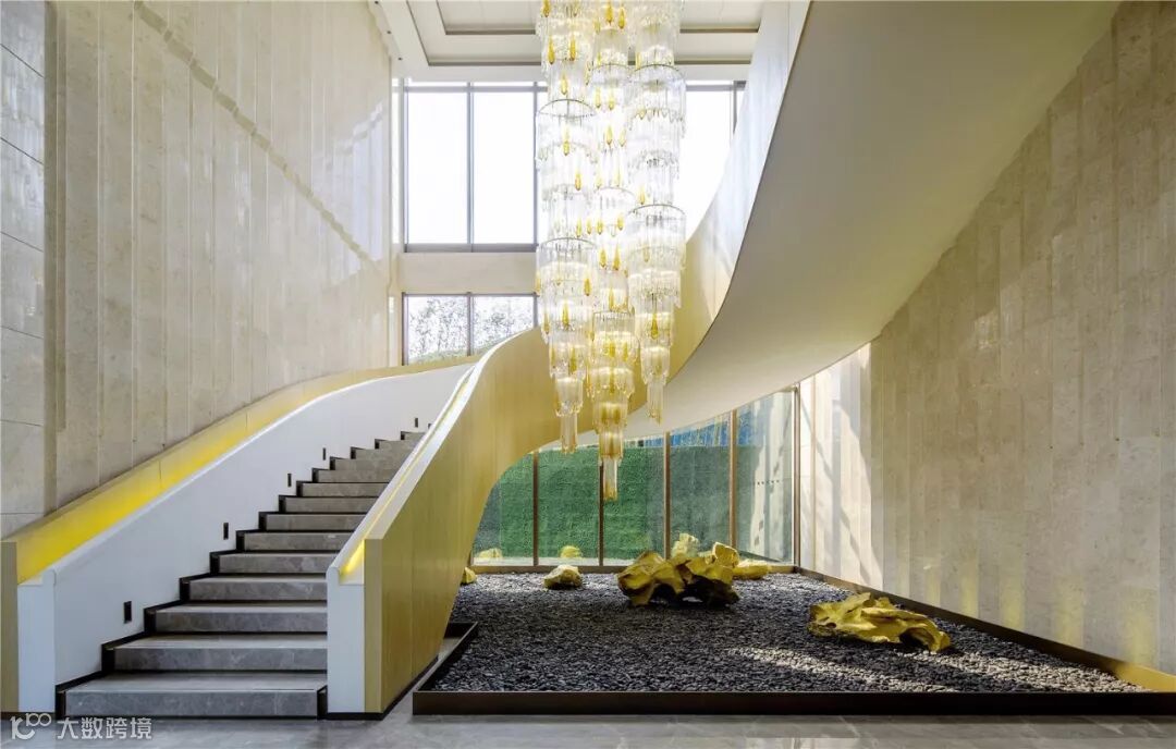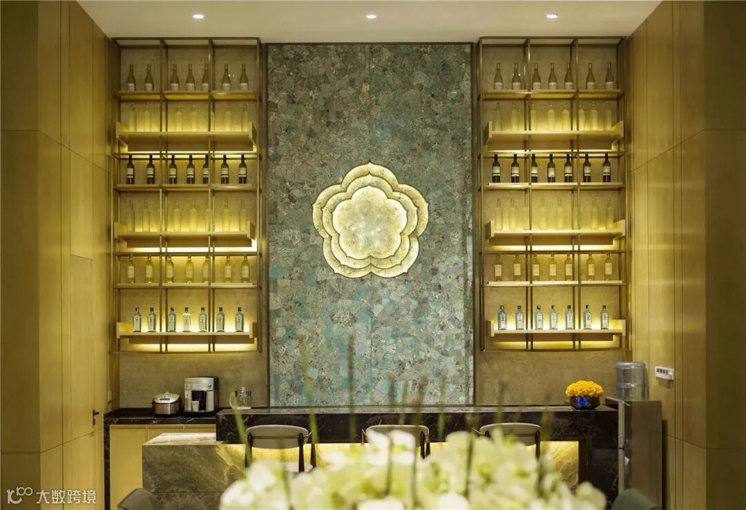 石材选材:室外黄金麻花岗岩;室内玛瑙玉、亚马逊绿石材、古堡灰石材