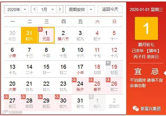 2020年元旦是1月1日,星期三,农历十二月初七,元旦,即公历的1月1日,是世界多数国家通称的“新年”。元,谓“始”,凡数之始称为“元”;旦谓“日”;“元旦”意即“初始之日”。元旦又称“三元”,即岁之元、月之元、时之元。由于地理环境和历法的不同,在不同时代,世界各国、各民族元旦的时间定位各不尽相同。公历日益为世界各国所公认。世界上大多数国家都采用了国际通行的公历,把每年1月1日作为“元旦”。以公历为历法的国家,都以每年公历1月1日为元旦日,举国放假。