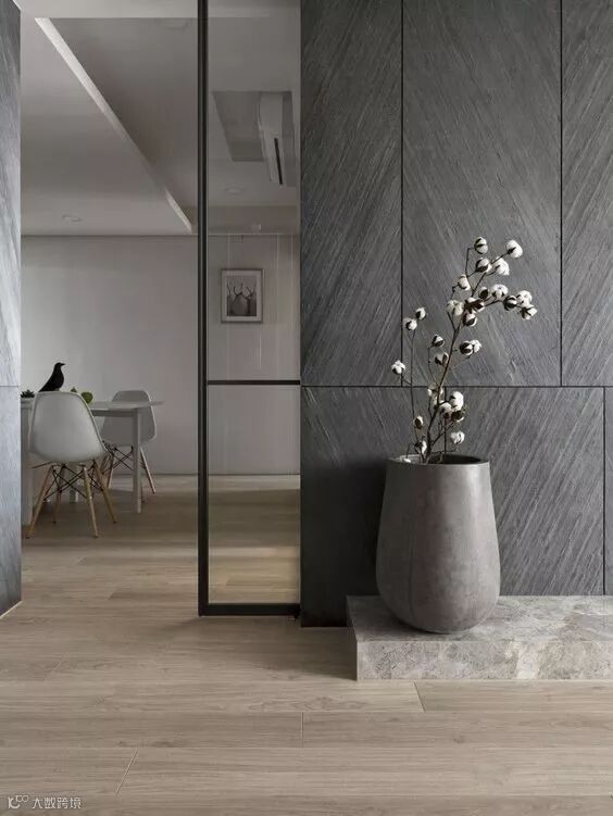 简约的空间充满禅意的和风花艺作品,是取巧的软装手法。线条精炼的明式平头案恰到好处地柔和了背景墙的冷硬质感。如果觉得单件条案视觉上略显单薄,可以在下部搭配装饰画,让玄关透气且不沉闷。