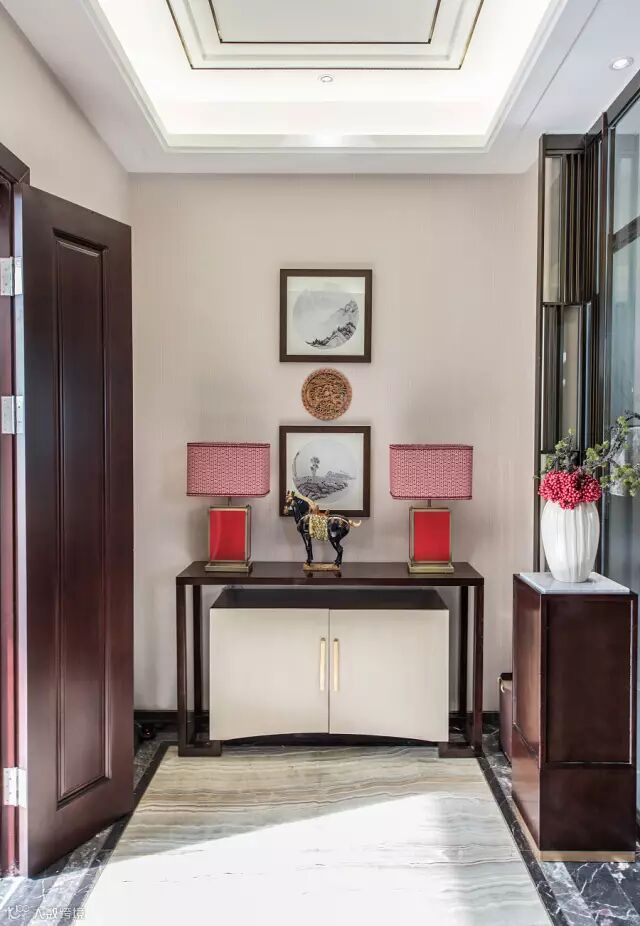玄关处巧妙的布置一组白色的玄关台,这是另一番感受,瞬间成为空间的聚焦点,桌面以上部分的用心布置,不论是插满花的黑瓷花瓶、还是墙面古色古香的山水画,都让人有吟诗一首的冲动。