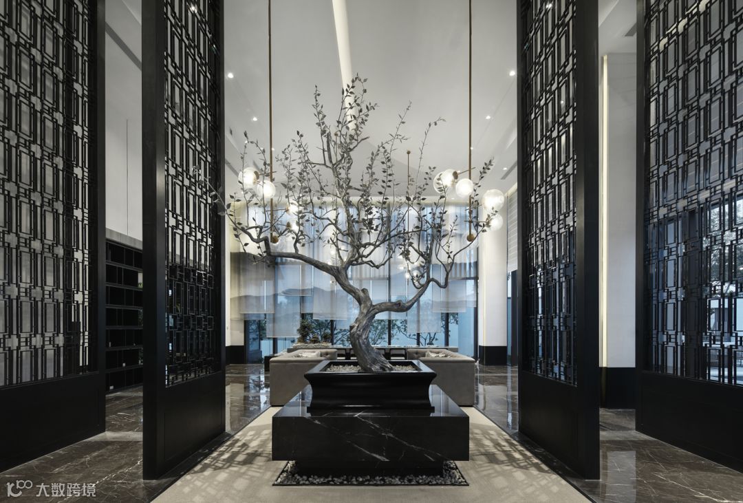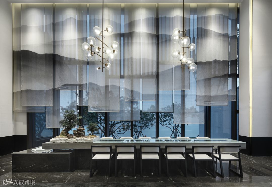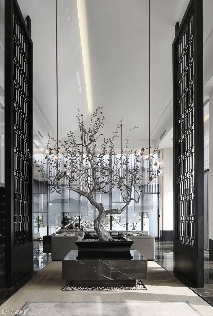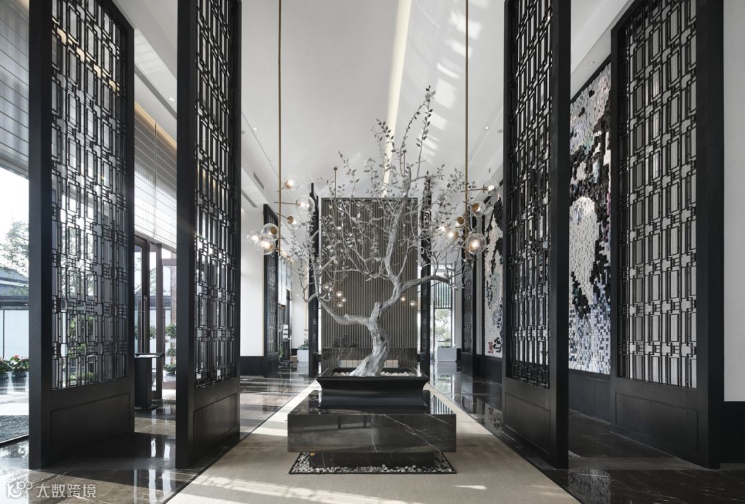 售楼处贯穿室内外景观和样板房的参观动线中,运用新中式的表现手法,让业主时刻感受中国传统文化。