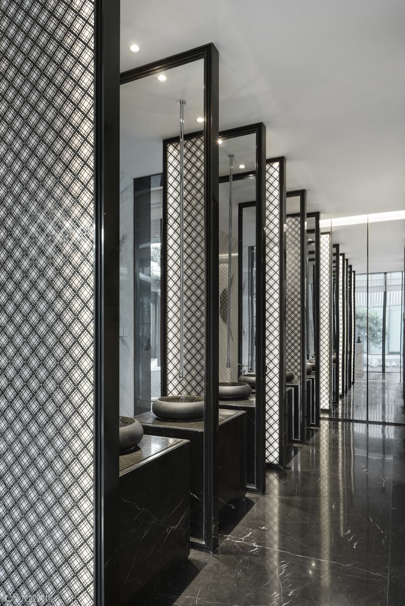 进门右转,忽逢一棵高大的桃花树,与接待台相对,在屏风之间安静伫立。四扇巨大屏风门在空间延伸,向前来的宾客开敞打开,大厅通透而明亮,空气与绿色从内部的景观庭院穿过,在空间之间自由流淌。