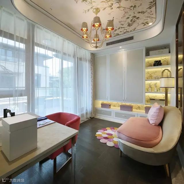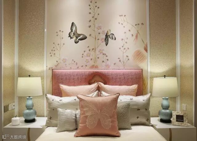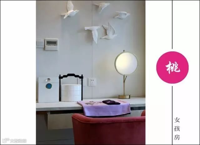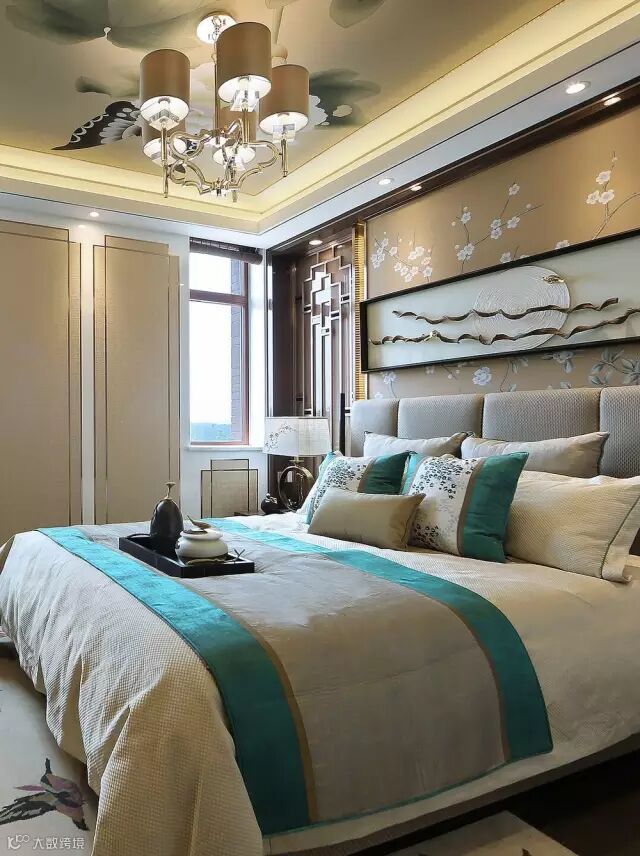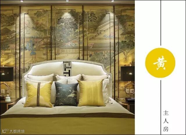 三楼主卧中最抢眼的莫过于墙面背景帝城与牡丹的图案,素有国花之称的牡丹代表富贵,有容纳天下的雍容气度。并于花开花落的自然规律中悟中国文化,巧妙地表达了“知进退、明舍得”的东方智慧。