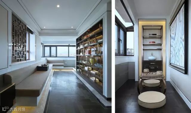干净利落的线条,静谧的灰、素简的白、优雅的棕。走道打破狭长增设书廊,采用透、挑、借等中式建筑设计手法营造了一个凭栏阅的书香意境。