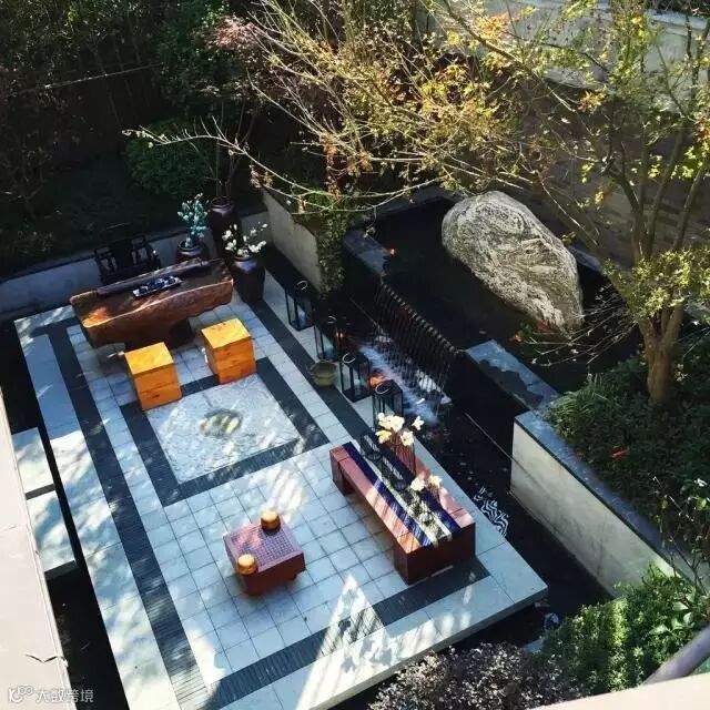 中式风格的庭院更注重地面的装饰,经常采用天然石材、卵石。庭院中洋溢着一股生命的力量。在传统的中式风格的庭院中,铺地材料通常选用不规则的鹅卵石和河石,还有丹波石和大理石铺装。此外还有碎石、残木、青苔石组和竹篱笆。