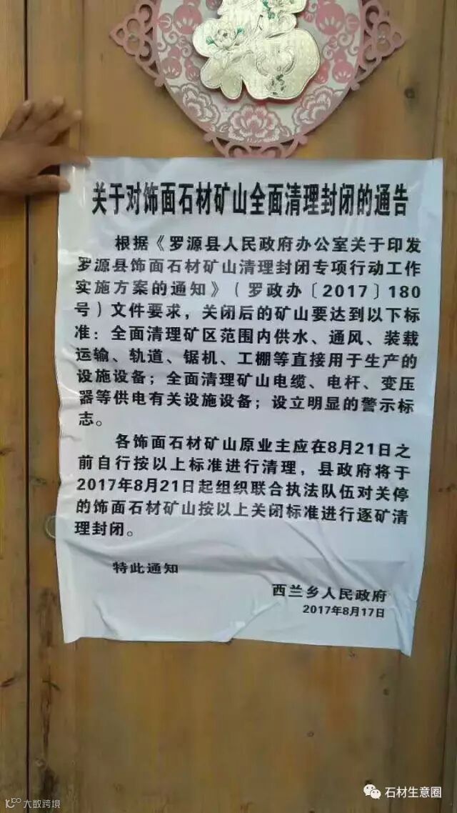 各饰面石材矿山原业主应在8月21日之前自行按以上标准进行清理,县政府将于2017年8月21日起组织联合执法队伍对关停的饰面石材矿山按以上关闭标准进行逐矿清理封闭。