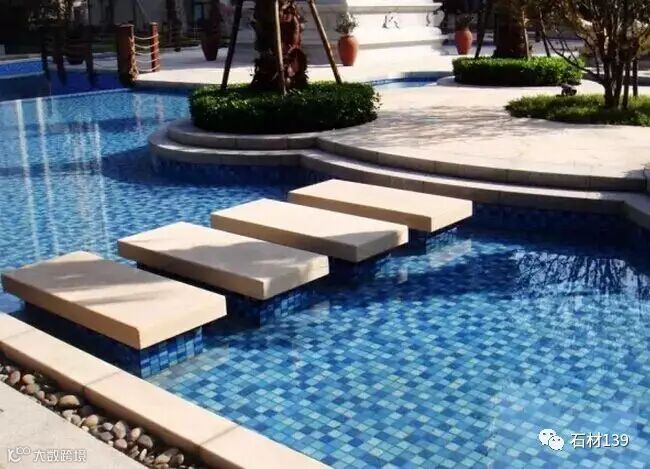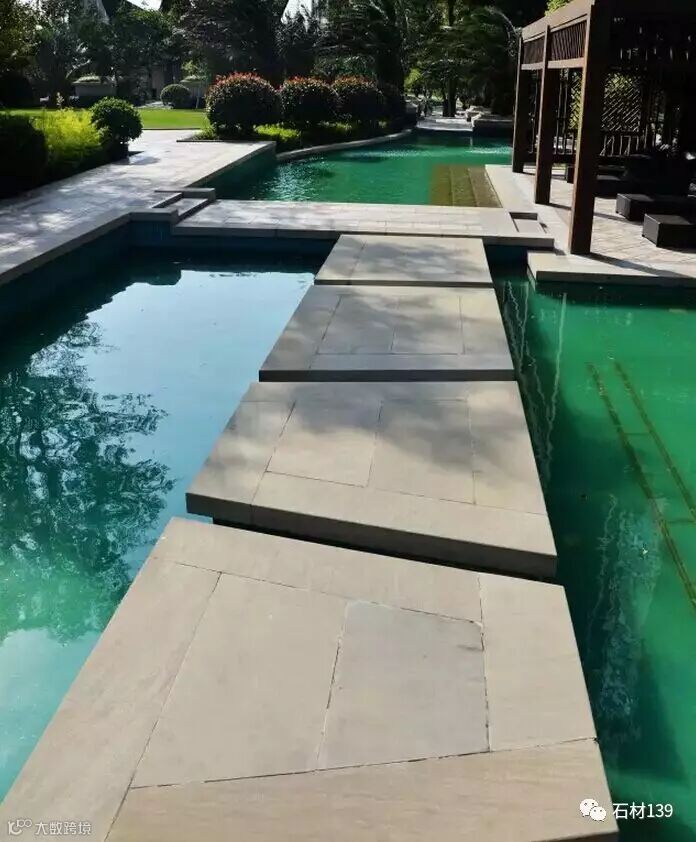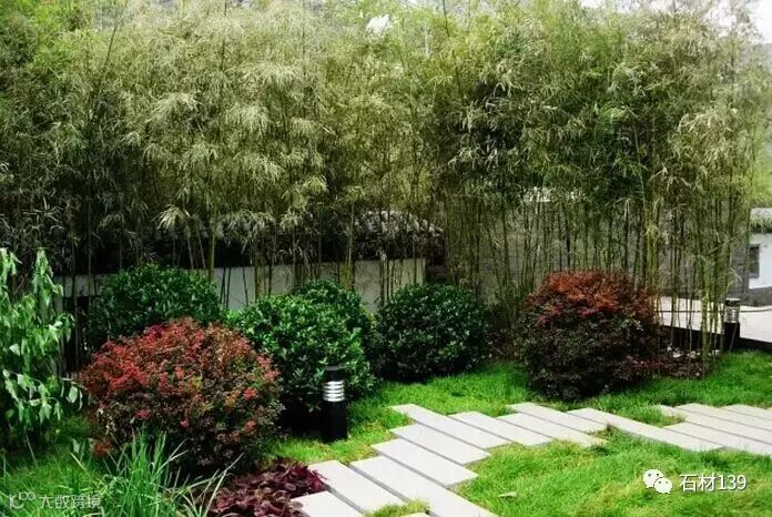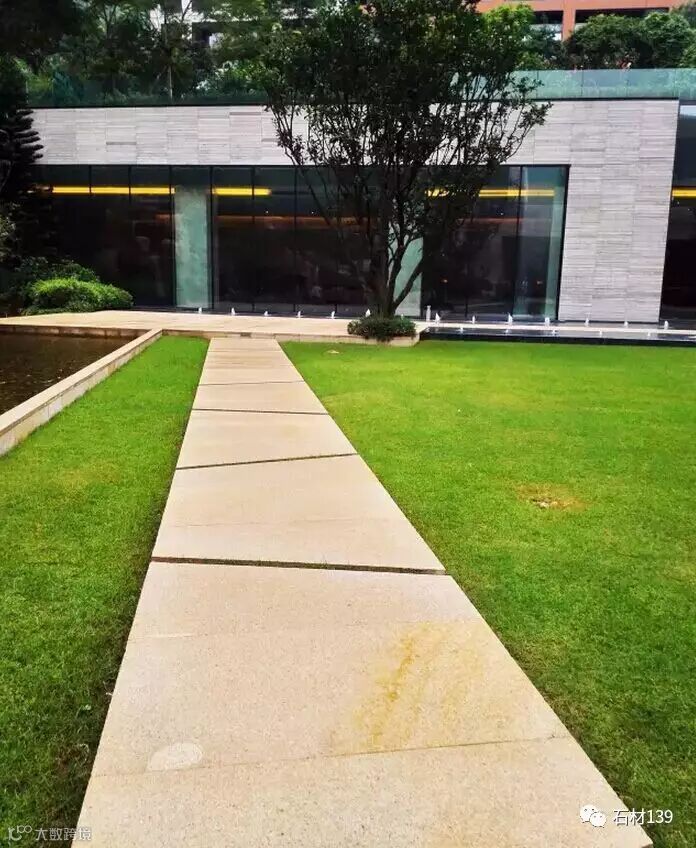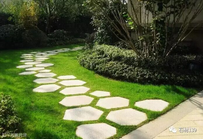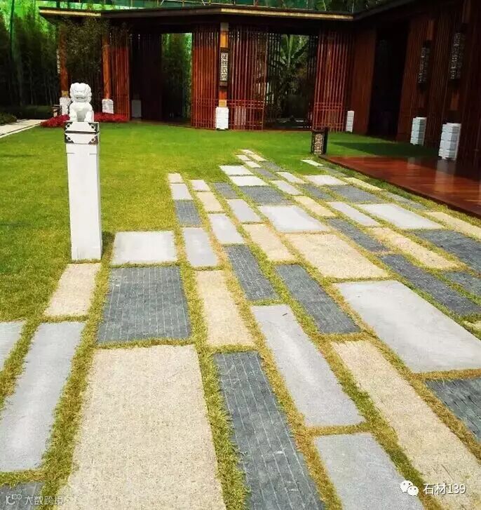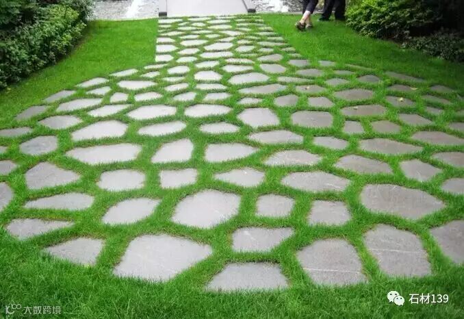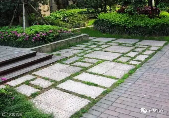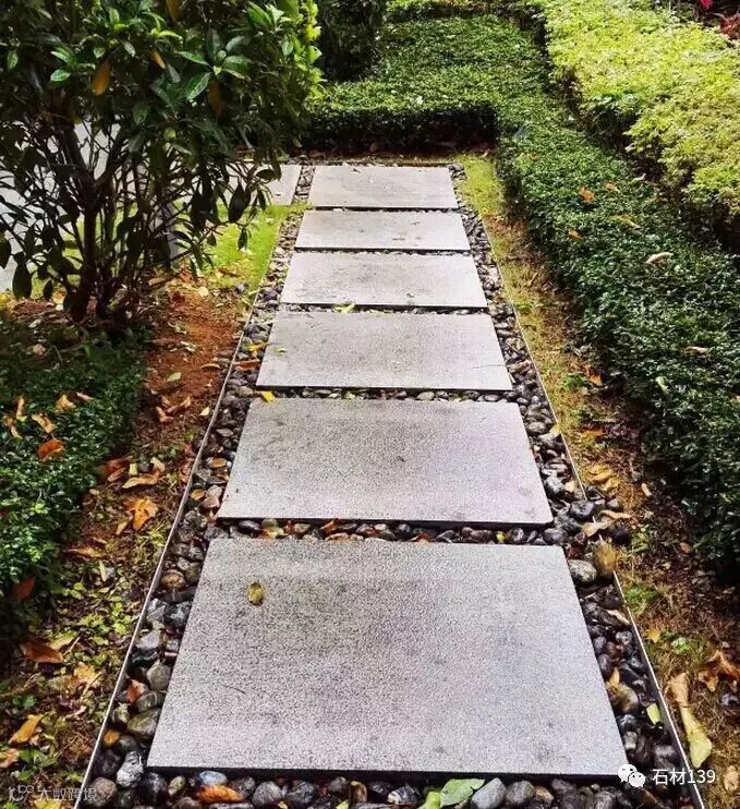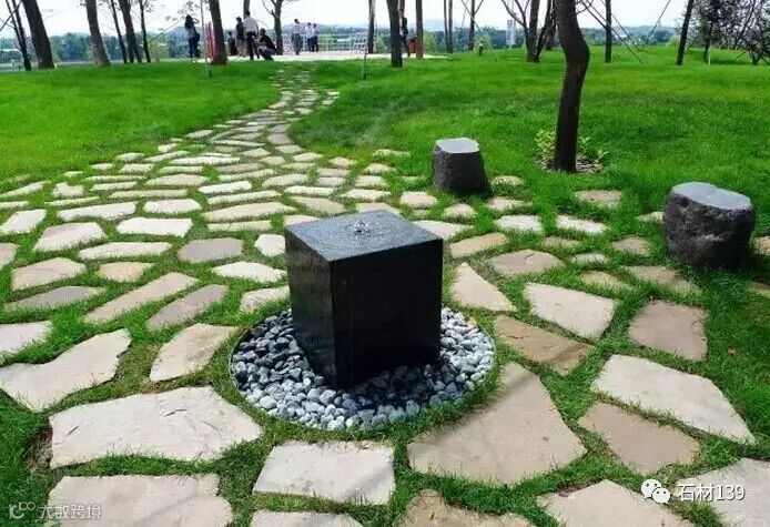 汀步在材料选择中,并无特别的要求。从安全性的考虑,要注意防滑、防跘,忌用光面、亚光面的石材,也不能用高差比较大的蘑菇面石材。