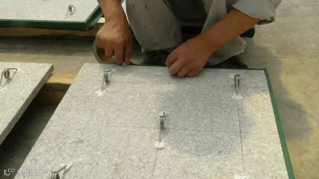 下面讲到重点,石材是务必要做背面处理的,目的有三:一是杜绝石材直接与混凝土接触表面而出现的泛碱白桦现象;二是吸收石材与混凝土因热膨胀率不同而发生的微小相对变位,三是预防没有锚固部分石材发生裂缝断裂时的掉落。(所用到的材料是树脂胶,硅砂以及防水密封胶)