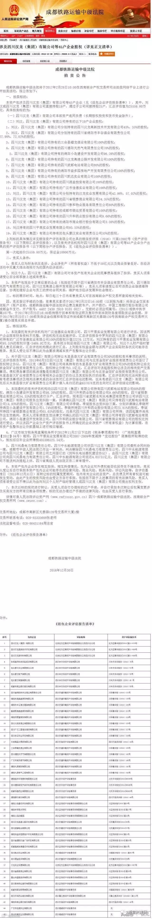 此前成都铁路运输中级法院曾发布公告,将于2017年2月28日10:00在西南联合产权交易所司法拍卖网络平台上公开拍卖刘汉和汉龙集团资产包,涉及汉龙集团等45户企业。其中,刘汉或汉龙集团直接持股19户,通过子公司间接持股25户,汇总评估值为2.56亿元。