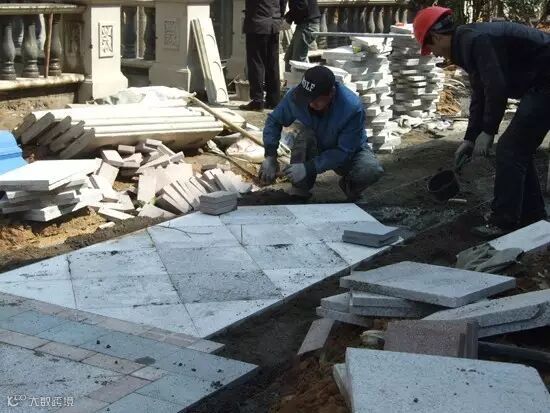 花岩铺好后,再用干燥的水泥粉撒在路面上并扫入砌块缝隙中,使缝隙填满,最后将多余的灰砂清扫干净。以后随石板下面的水泥砂浆慢慢硬化,石板与下面稳定层紧密结合在一起,施工完了后,应多浇水进行养护。
