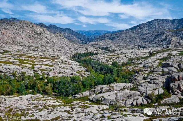 也许是因为石坪地形比较平缓的原因,流经此地的汗德尕特河竟然在坚硬的花岗岩中切出了优美的河曲。虽然世界上的河曲多发育在具有松软沙土层的冲积平原上,但也不乏在较坚硬的砂岩、石灰岩中形成的深切河曲,其决定因素在于河曲形成初始是否具有平缓的地形面,从而使水流流向呈现自由摆动的特点。这种机制,在五指泉坚硬但却平缓的花岗岩石坪上恰恰得到了体现。沿着曲流的河滩,是一溜浓密的树荫,在灰色的花岗岩石坪中,它就像一串醒目的翡翠项链,把汗德尕特河曲的轨迹勾画得十分清晰。