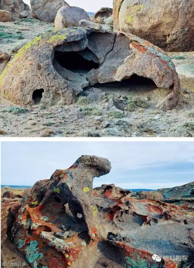 恰勒什海花岗岩岩丘的奇特还不止于石臼,更在于岩丘边坡那些鬼斧神工的石穴。石穴在新疆许多地方的不同岩石地貌中都有出现,在可可托海的花岗岩石峰表面也十分常见。但那些石穴主要是由岩石中成分不同的部分因差异风化先行脱落所致,因此这类石穴深度一般不大,连通性也不好,更像是石壁上密集的佛龛。而恰勒什海的石穴多具有复杂的蜂巢结构,大小不一的蜂窝状石穴常常是连通的,仿佛精巧的镂空石雕。巨大的花岗岩石蛋会因为石穴的发育而内部被掏空,就像一个个残破的蛋壳,有的巨石还可以被石穴洞穿,形成更为奇异的各种造型。