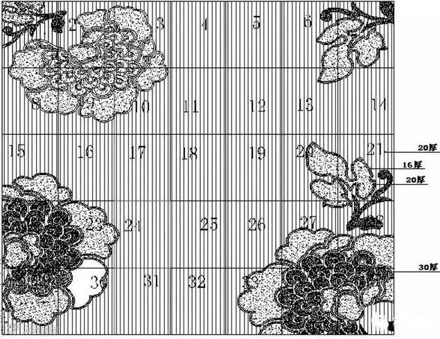 打印、拼装图纸:依据生产加工单上的拼花图案打印1:1图纸,图纸越大越好,以防因图纸拼接次数太多而影响产品质量。