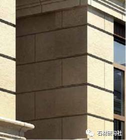 法式别墅的板块相对来说做得都比较小,甚至有些工程采用了 300X700 的小板块来拼接,究其原因无非是建筑体量不大,如采用标准的 600X900 板块,则显得整体比例极不协调,另外砂岩、石灰岩等石材强度等级较低,石材孔隙率较高,大板块的石材将增加其受力,因此一般都会采用小板块拼装。