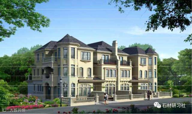对于外立面材料方面,法式别墅也是非常讲究的,在遥远的欧洲,古老的先民们采用整块的天然石材来筑造,而时至今日,由于石材幕墙工艺的不断改进,它已经能更好得起到装饰、围合的作用。石材研习社stone5A