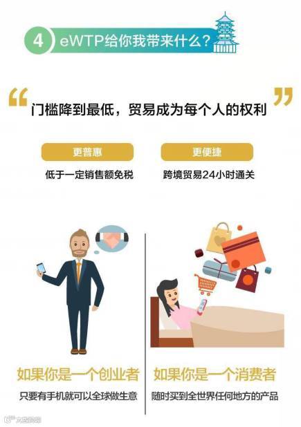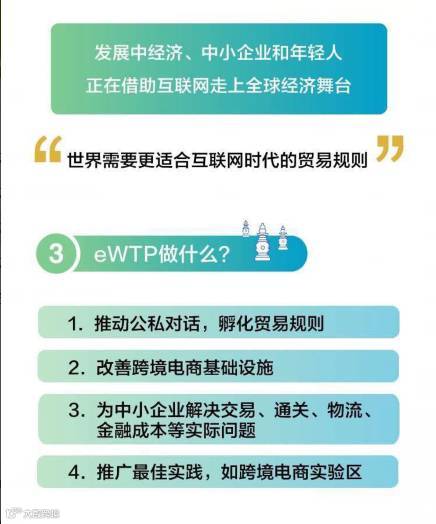 如何解决这一问题?马云在2016年3月博鳌亚洲论坛上第一次提出eWTP(世界电子贸易平台)。按照阿里巴巴官方说法,eWTP是指由一个私营部门引领、市场驱动、多利益攸关方参与的国际合作平台(机制)。