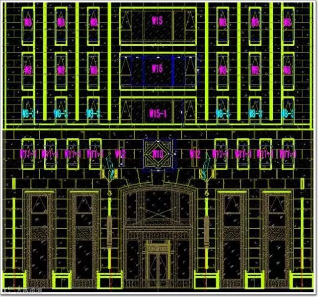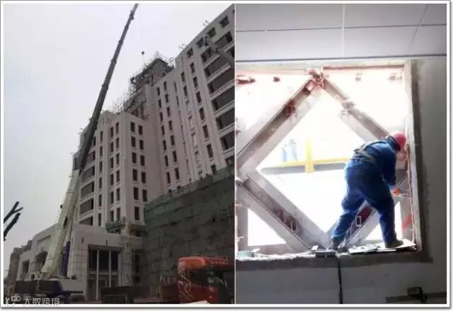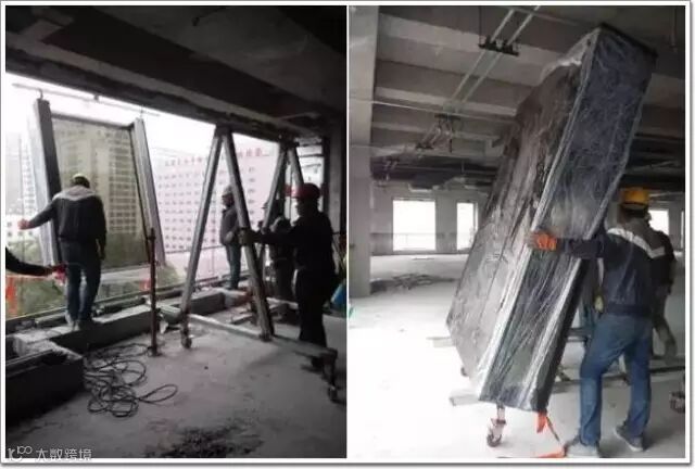 4.本工程窗系统打破了常规做法(未使用钢副框连接系统),窗户采用上下支点式固定方式,其中W15窗型为组合窗:是由5樘单元窗,1樘约6㎡单元窗、2樘带开启的单元窗、2樘转角单元窗组合而成。其中W15-1窗户尺寸约达到六平方米,这给后续的安装工作带来了一定的难度,后经多种试验、实践和对工具的改装,及吊装设备配合施工完成窗户整体的安装工作。