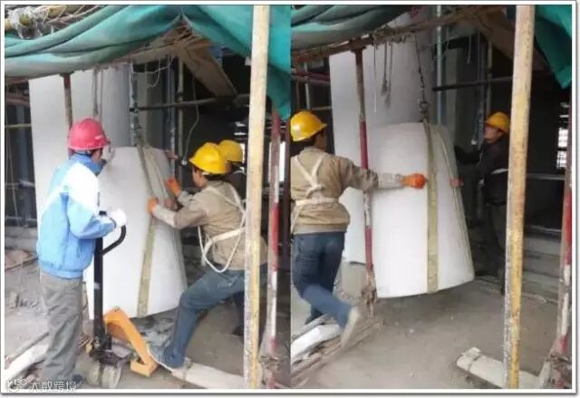 3.在第2-3层间排布了15根直径为1米大圆柱,柱子石材厚50mm,每根柱高约7.5米,由几节不同尺寸的小柱子拼接而成,因质量要求高,每节柱子之间采用了密拼工艺,无缝对接!