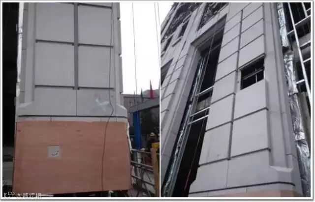 7.为保证幕墙不出现色差,对于石材的色差控制也是极其严格,在石材到场后先预排板筛色差,上墙后整体观察,再将出现色差的石材进行标记、拆除、更换,直至石材墙面基色一致。