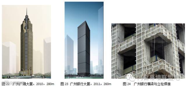 第二高的石材幕墙工程是广州银行大厦(图23),黑色花岗岩石材幕墙高260.9m,27层以下短槽连接,27~58层背栓连接,注胶。采用镀锌钢型材,横梁与立柱焊接(图24)。
