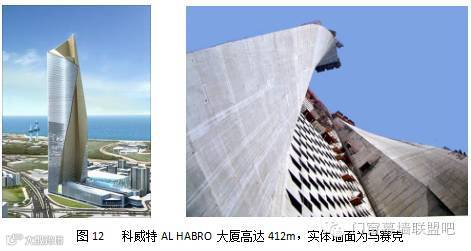 目前正在建造的科威特的AL HABRO 大厦,设计花岗岩幕墙高度达412m(图12,)。后来考虑到曲面拟合困难,以及倒挂石板的安全问题,实际施工时改为马赛克薄板。