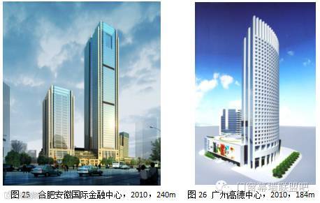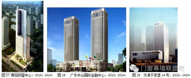 2010年超高石材幕墙大量兴建,而且多数都超过200m的高度(图22~图33)。目前国内最高石材幕墙工程是广州广晟大厦(图22),建筑高度313m,花岗岩幕墙高度280m,背栓连接。