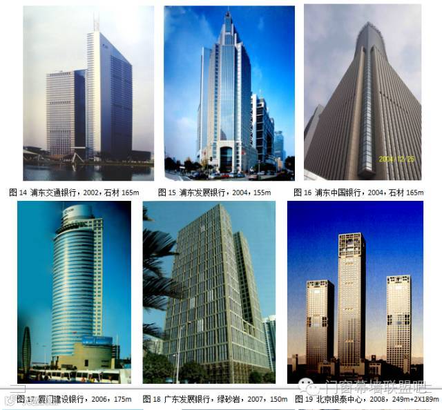 2000年以后,我国经济腾飞,金融机构迅速发展,要求新建高层办公楼。石材具有稳重、长远、耐久、可靠的性格,从来都是银行建筑的首选外装材料,于是超高石材幕墙需求猛增。尤其是上海、广东、福建等金融业发达地区,新建了不少150m以上的石材幕墙工程(图14~图19)。由于高度超出了JGJ 133-2001的适用范围,这些工程都进行了专家论证,并采取了加强措施。